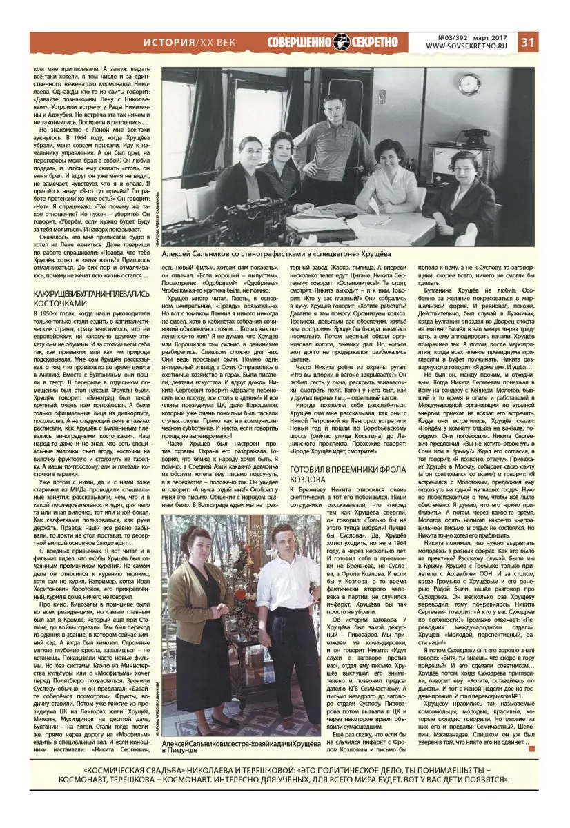 В прошлом номере в статье «Когда Хрущёва хотели отравить» («Совершенно секретно» №2/391, февраль 2017) мы начали публикацию воспоминаний подполковника 9-го управления КГБ СССР Алексея Сальникова о его 40-летней работе с первыми лицами нашего государства. Он был человеком с уникальными знаниями и громадным опытом и отвечал за бытовое обеспечение глав правительства и высших партийных руководителей СССР, а также безопасность в этой сфере с 1956 по 1996 год.