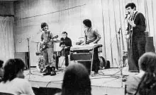 | «Машина времени», 1971 год (слева направо): Александр Кутиков, Максим Капитановский, Сергей Кавагое, Андрей Макаревич. Через полгода группа лишилась своего барабанщика | |