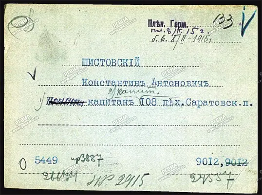 «108-й пехотный Саратовский полк перестал существовать, – это уже из воспоминаний командира полка Валериана Белолипецкого, – от него остались небольшие группы…» Из всего 20-го корпуса смогли выйти из окружения всего лишь около 1400 человек, но брата деда в их числе не было. Но позже на его учётной карточке проставят штамп: «Плен. Герм.». Там же зачёркнуто звание – «штабс-капитан», и от руки вписано: капитан. То есть повышен в чине, невзирая на плен! Тогда же Константин Шистовский, несмотря на пребывание в плену, награждён орденами Святой Анны 4-й степени с надписью «За храбрость» и Святой Анны 3-й степени с мечами и бантом – «За отличия в делах против неприятеля».
