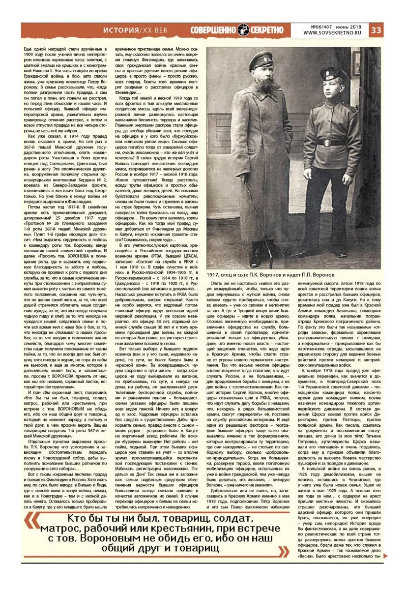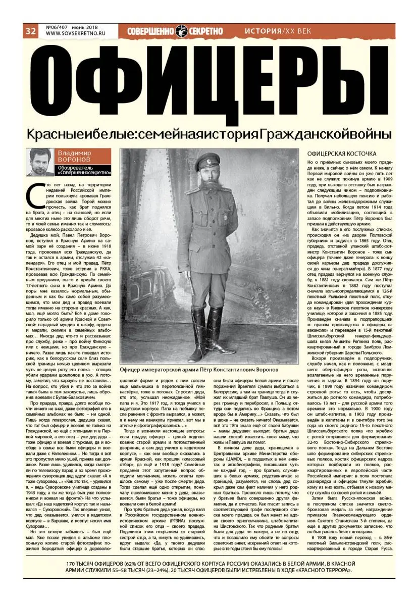 Дедушка мой, Павел Петрович Воронов, вступил в Красную Армию на самой заре её создания – в июне 1918 года, провоевал всю Гражданскую, да так и остался в армии, отслужив 42 «календаря». Его отец и мой прадед, Пётр Константинович, тоже вступил в РККА, провоевав всю Гражданскую. По семейным преданиям, он-то и привёл своего 17-летнего сына в Красную Армию. До поры мне казалось нормальным, обыденным и как бы само собой разумеющимся, что мои дед и прадед воевали тогда именно на стороне красных. А как, мол, ещё могло быть? Всё в доме говорило только об армии Красной и Советской: парадный мундир в шкафу, ордена и медали, снимки в семейных альбомах… Иногда дед что-то и рассказывал: про службу, реже – про войну Финскую или с немцами, но про Гражданскую – ничего. Разве лишь как-то поведал историю, как в белорусском селе близ польской границы ночью целиком вырезали чуть не целую роту его полка – спящих убили ударами шомполов в ухо. А потому, заметил, что караулы не поставили… На вопрос, кто убил и что это за война такая была в том захолустье, лишь обронил: воевали с Булак-Балаховичем.