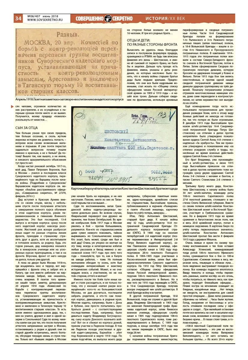 Когда настал роковой октябрь 1917-го, мой дед, Павел Петрович Воронов, был в Москве – учился в последнем классе Суворовского кадетского корпуса, переведённого туда из Варшавы после начала войны. (Подробнее о Суворовском/Варшавском кадетском корпусе см. материал «Альбом расстрелянного офицера», «Совершенно секретно», № 2/379, февраль 2016 г.)
