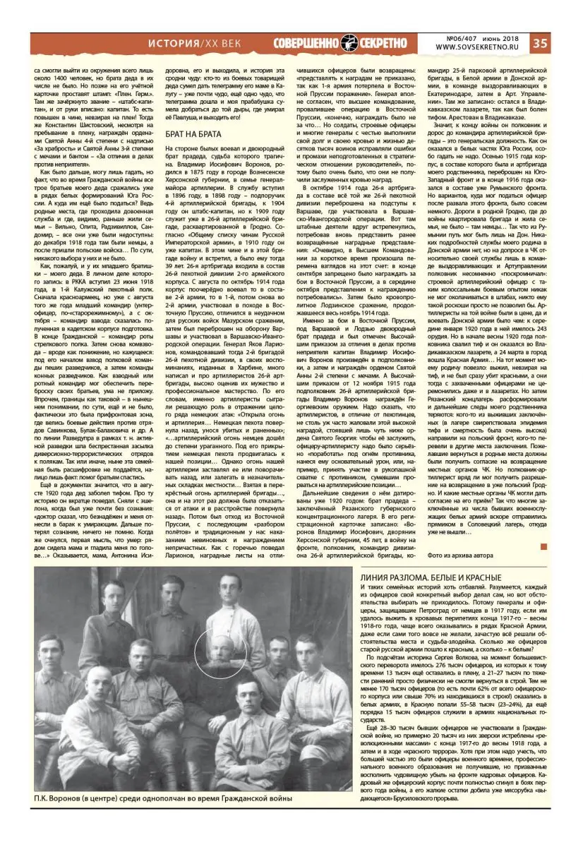 На стороне былых воевал и двоюродный брат прадеда, судьба которого трагична. Владимир Иосифович Воронов, родился в 1875 году в городе Вознесенске Херсонской губернии, в семье генерал-майора артиллерии. В службу вступил в 1896 году, в 1898 году – подпоручик 4-й артиллерийской бригады, к 1904 году он штабс-капитан, но к 1909 году служит уже в 26-й артиллерийской бригаде, расквартированной в Гродно. Согласно «Общему списку чинам Русской Императорской армии», в 1910 году он уже капитан. В этом чине и в этой бригаде войну и встретил, а было ему тогда 39 лет. 26-я артбригада входила в состав 26-й пехотной дивизии 2-го армейского корпуса. С августа по октябрь 1914 года корпус поочерёдно воевал то в составе 2-й армии, то в 1-й, потом снова во 2-й армии, участвовал в походе в Восточную Пруссию, отличился в неудачном для русских войск Мазурском сражении, затем был переброшен на оборону Варшавы и участвовал в Варшавско-Ивангородской операции. Генерал Яков Ларионов, командовавший тогда 2-й бригадой 26-й пехотной дивизии, в своих воспоминаниях, изданных в Харбине, много написал и про артиллеристов 26-й артбригады, высоко оценив их мужество и профессиональное мастерство. По его словам, именно артиллеристы сыграли решающую роль в отражении целого ряда немецких атак: «Открыла огонь и артиллерия… Немецкая пехота повернула назад, унося убитых и раненных»; «…артиллерийский огонь немцев дошёл до степени ураганного. Под его прикрытием немецкая пехота продвигалась к нашей позиции… Однако огонь нашей артиллерии заставлял ее или поворачивать назад, или залегать в незначительных складках местности… Взятая в перекрёстный огонь артиллерией бригады…, она и на этот раз должна была отказаться от атаки и в расстройстве повернула назад». Потом был отход из Восточной Пруссии, с последующим «разбором полётов» и традиционным у нас наказанием невиновных и награждением непричастных. Как с горечью поведал Ларионов, наградные листы на отличившихся офицеров были возвращены: «представлять к наградам не приказано, так как 1-я армия потерпела в Восточной Пруссии поражение». Генерал вполне согласен, что высшее командование, провалившее операцию в Восточной Пруссии, «конечно, награждать было не за что… Но солдаты, строевые офицеры и многие генералы с честью выполнили свой долг и своею кровью и жизнью десятков тысяч воинов исправляли ошибки и промахи неподготовленных в стратегическом отношении руководителей», потому было очень было, что они не получили заслуженных кровью наград.