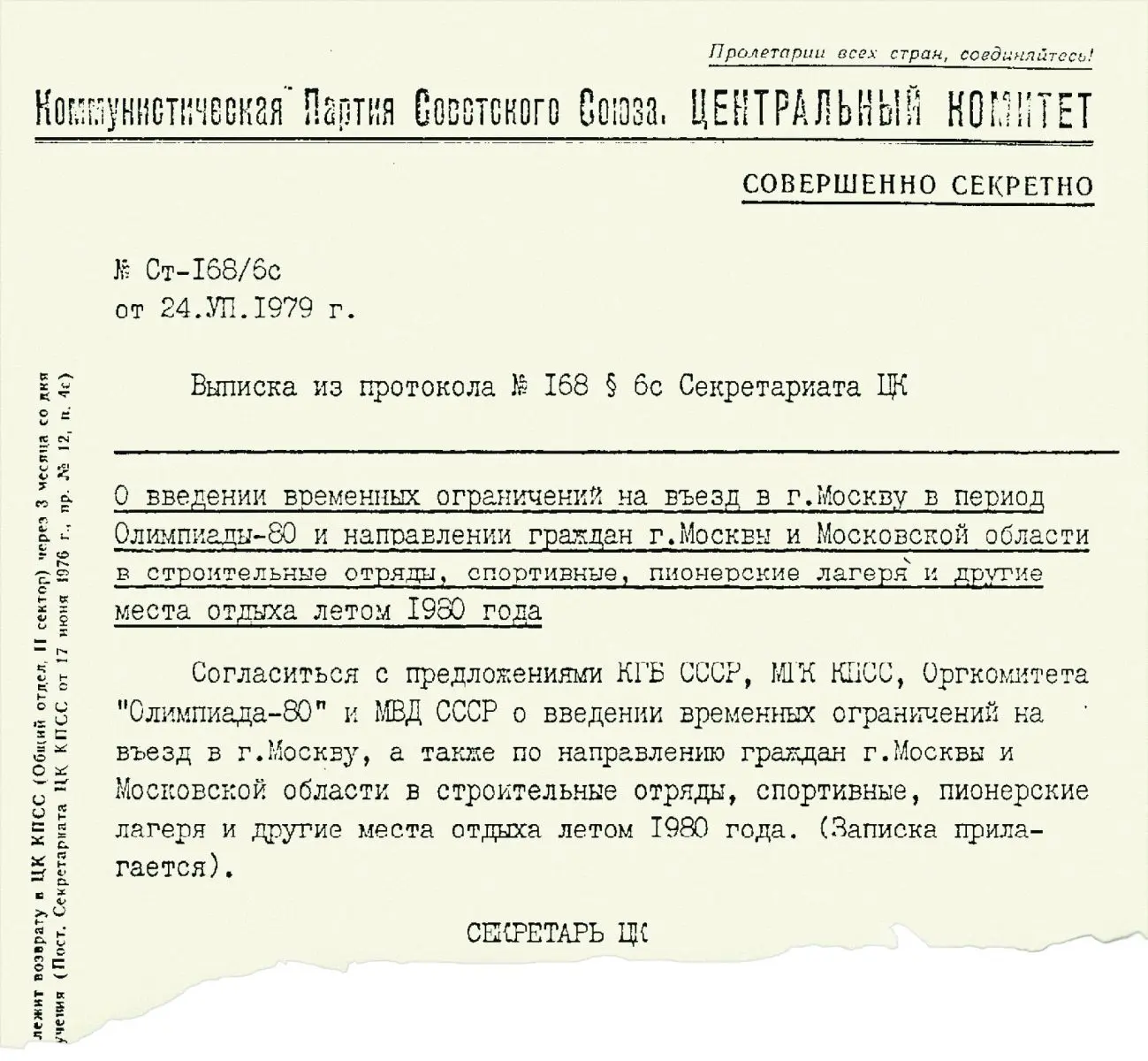 24 июля 1979 года Секретариат ЦК КПСС принял эпохальное решение под грифом «Совершенно секретно»: «О введении временных ограничений на въезд в г. Москву в период Олимпиады-80 и направлении граждан г. Москвы и Московской области в строительные отряды, спортивные, пионерские лагеря и другие места отдыха летом 1980 года».