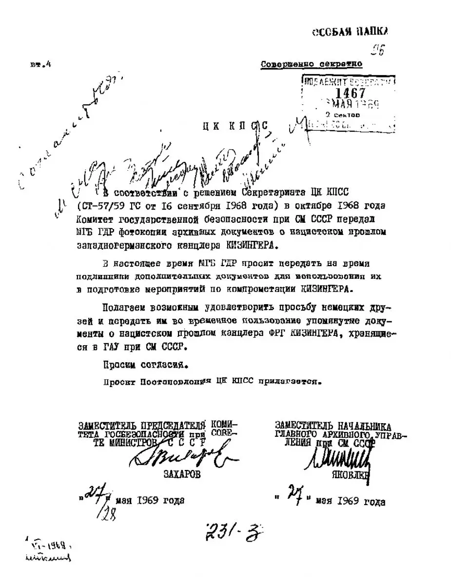 «В соответствии с решением Секретариата ЦК КПСС (СТ-57/59 ГС от 16 сентября 1968 года) в октябре 1968 года Комитет государственной безопасности при СМ СССР передал МГБ ГДР фотокопии архивных документов о нацистском прошлом западногерманского канцлера КИЗИНГЕРА. В настоящее время МГБ ГДР просит передать на время подлинники дополнительных документов для использования их в подготовке мероприятий по компрометации КИЗИНГЕРА. Полагаем возможным удовлетворить просьбу немецких друзей и передать им во временное пользование упомянутые документы о нацистском прошлом канцлера ФРГ КИЗИНГЕРА, хранящиеся в ГАУ при СМ СССР.