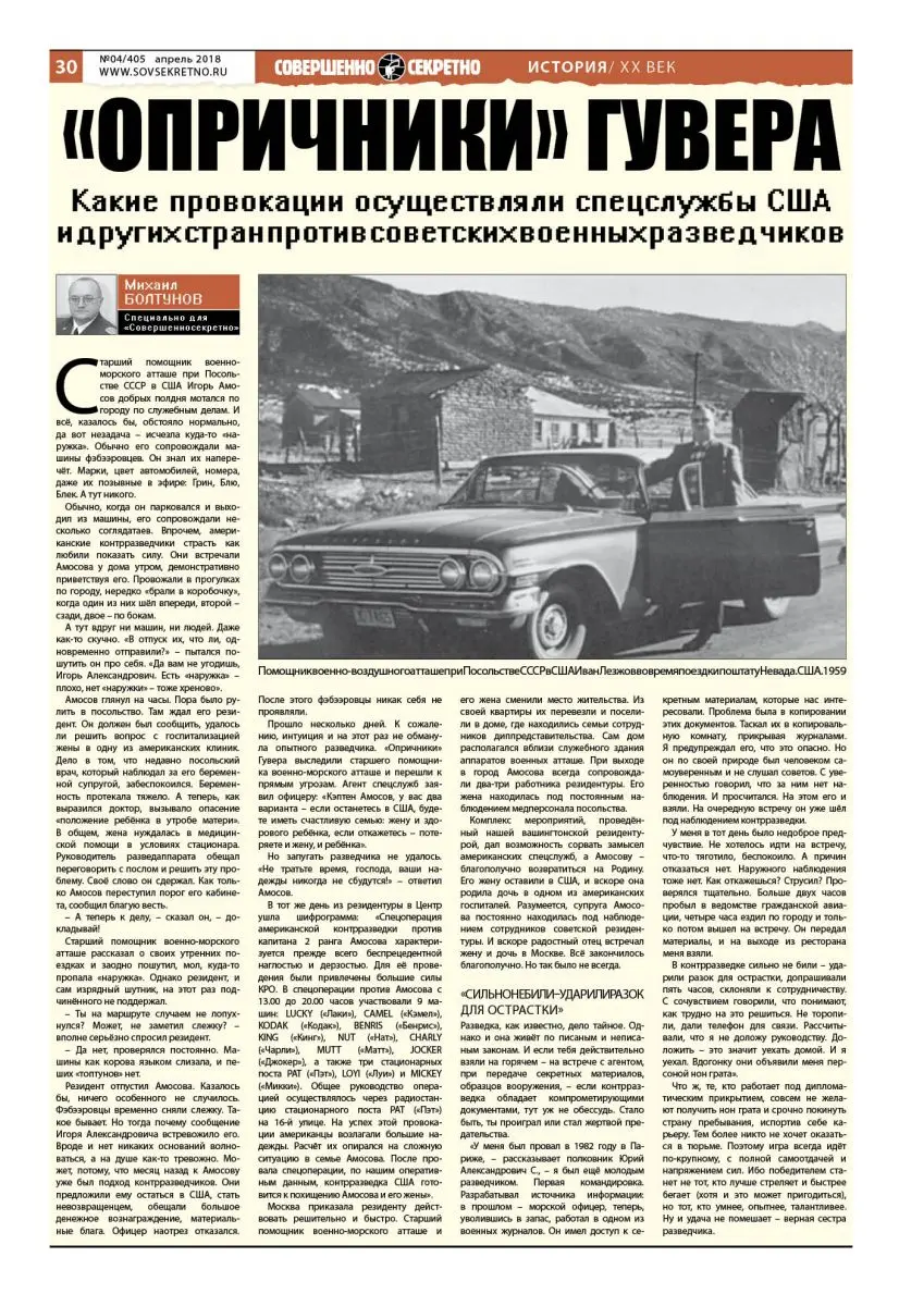 В тот же день из резидентуры в Центр ушла шифрограмма: «Спецоперация американской контрразведки против капитана 2 ранга Амосова характеризуется прежде всего беспрецедентной наглостью и дерзостью. Для её проведения были привлечены большие силы КРО. В спецоперации против Амосова с 13.00 до 20.00 часов участвовали 9 машин: LUCKY («Лаки»), CAMEL («Кэмел»), KODAK («Кодак»), BENRIS («Бенрис»), KING («Кинг»), NUT («Нат»), CHARLY («Чарли»), MUTT («Матт»), JOCKER («Джокер»), а также три стационарных поста PAT («Пэт»), LOYI («Луи») и MICKEY («Микки»). Общее руководство операцией осуществлялось через радиостанцию стационарного поста PAT («Пэт») на 16-й улице. На успех этой провокации американцы возлагали большие надежды. Расчёт их опирался на сложную ситуацию в семье Амосова. После провала спецоперации, по нашим оперативным данным, контрразведка США готовится к похищению Амосова и его жены».