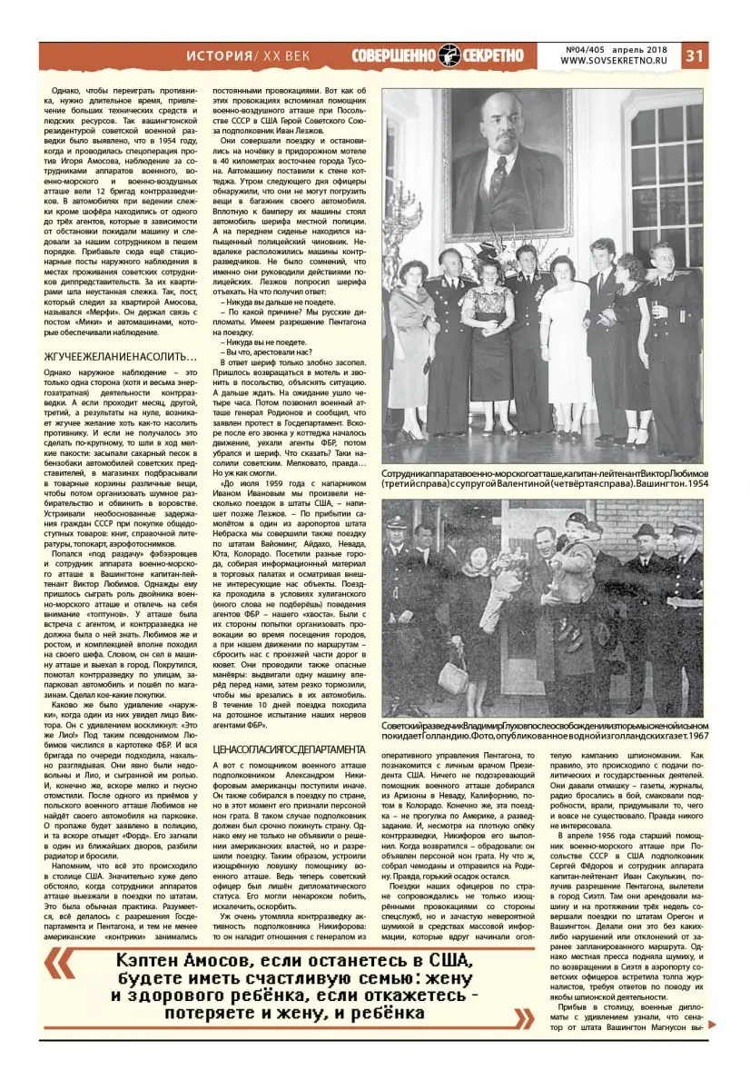 Обычно, когда он парковался и выходил из машины, его сопровождали несколько соглядатаев. Впрочем, американские контрразведчики страсть как любили показать силу. Они встречали Амосова у дома утром, демонстративно приветствуя его. Провожали в прогулках по городу, нередко «брали в коробочку», когда один из них шёл впереди, второй – сзади, двое – по бокам.