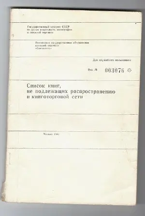 Передо мной лежит замечательная книга со скучным названием «Список книг, не подлежащих распространению в книготорговой сети». Это изданный в 1981 году библиографический указатель книг, которые в разное время начиная с 1949 года приказами Главлита изымались из магазинов. Естественно, на обложке есть гриф «Для служебного пользования» и номер конкретного экземпляра…