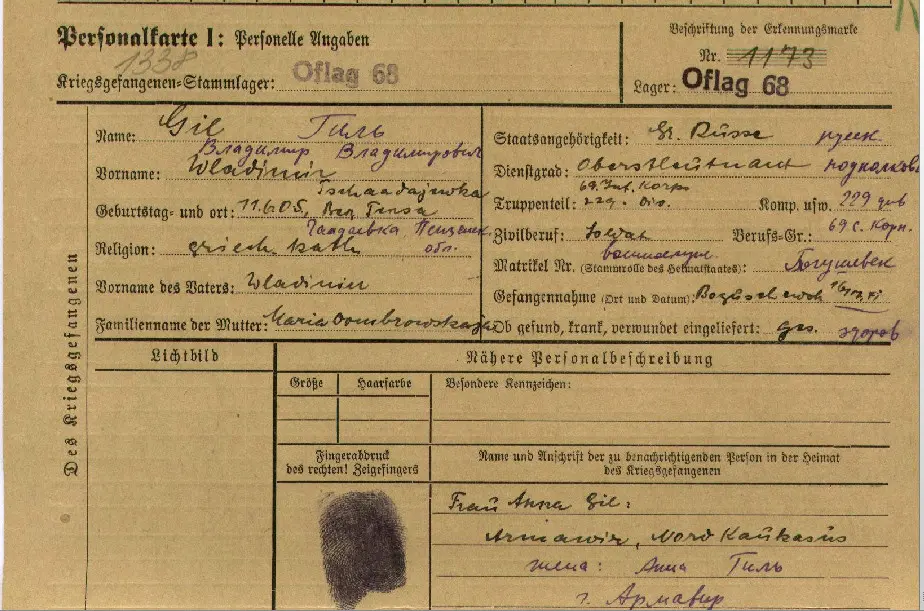 Персональная карта, заведенная на В.В. Гиля в лагере для пленных офицеров («Офлаг-68») в Сувалках, 1941