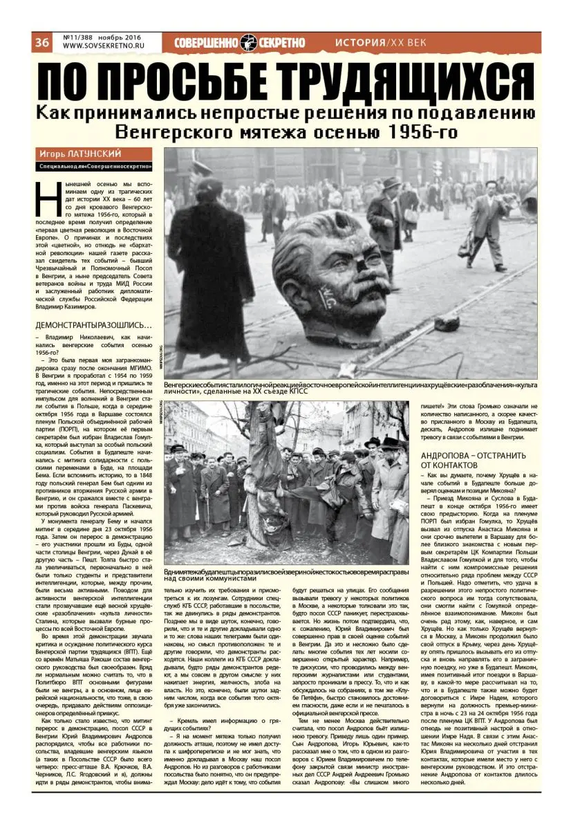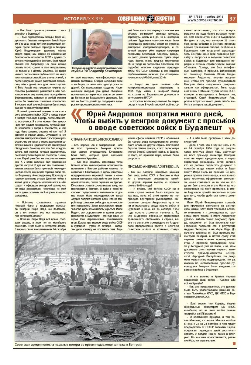 Меня Юрий Владимирович привлёк для прочтения документа на венгерском языке, этот текст требовал особого внимания, и я докладывал по проектам этого текста. В итоге Андропову удалось выбить такой документ, правда, оформлен он был несколько своеобразно: подписал его в результате Андраш Хегедюш, а не Имре Надь. До ночного пленума он был премьер-министром Венгрии, а потом сразу стал первым заместителем премьер-министра. А прежней премьерской печати у Хегедюша уже не было, и на этом документе стоит печать первого заместителя премьер-министра Венгерской Народной Республики. Но документ однозначно подтверждает, что да, именно по настоятельной просьбе руководства Венгрии были введены советские войска в Будапешт.