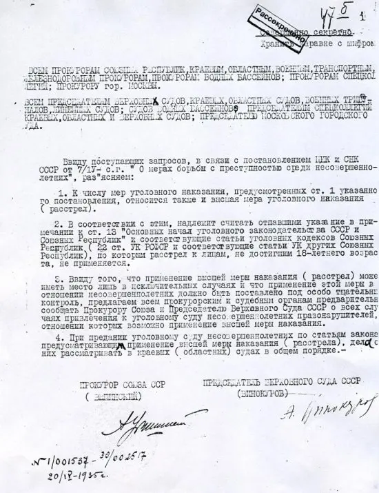 Хранить наравне с шифром», разосланное всем прокурорам и председателям судов: «Ввиду поступающих запросов, в связи с постановлением ЦИК и СНК СССР от 7 апреля с. г. «О мерах борьбы с преступностью среди несовершеннолетних», разъясняем: