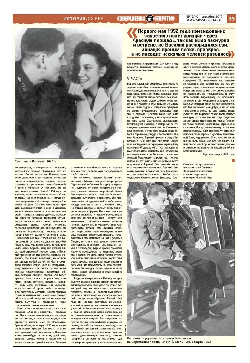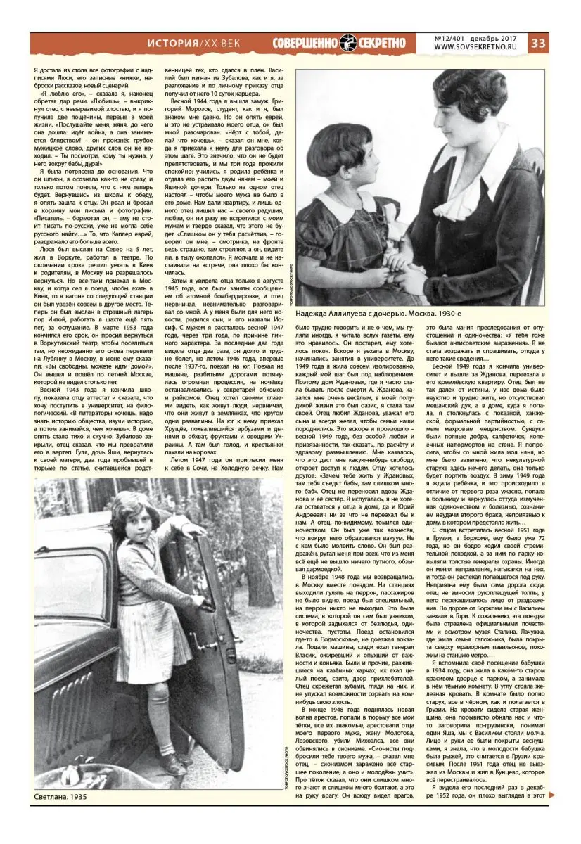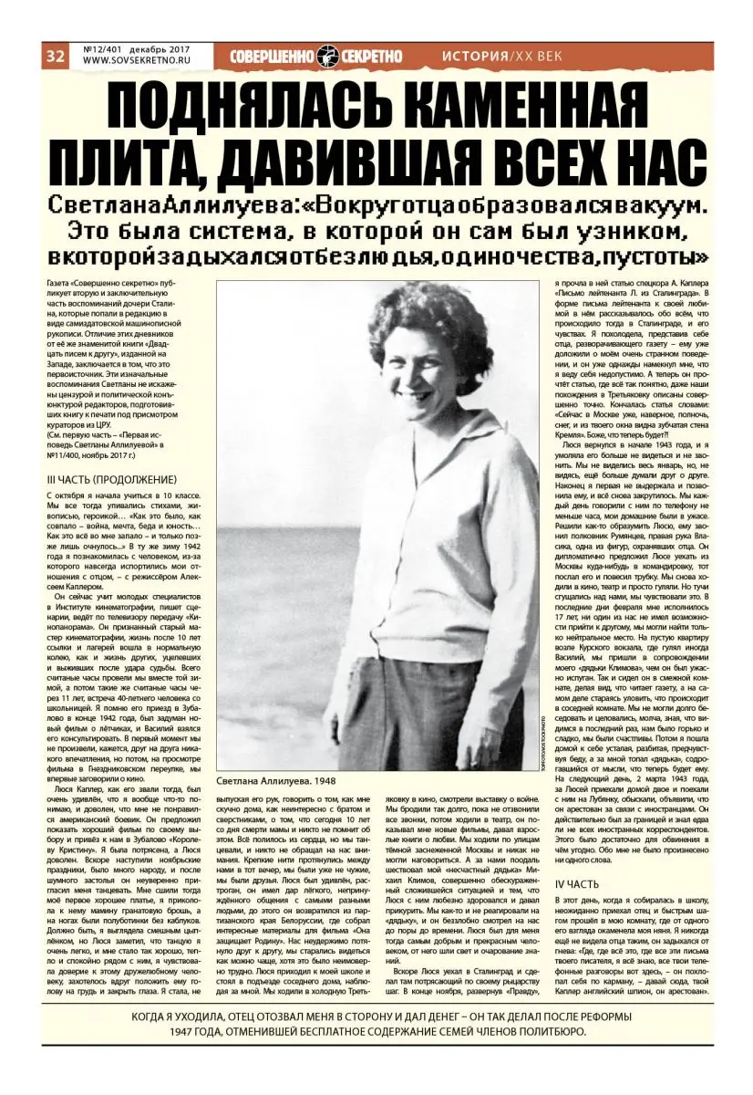 Газета «Совершенно секретно» публикует вторую и заключительную часть воспоминаний дочери Сталина, которые попали в редакцию в виде самиздатовской машинописной рукописи. Отличие этих дневников от её же знаменитой книги «Двадцать писем к другу», изданной на Западе, заключается в том, что это первоисточник. Эти изначальные воспоминания Светланы не искажены цензурой и политической конъюнктурой редакторов, подготовивших книгу к печати под присмотром кураторов из ЦРУ.(См. первую часть – «Первая исповедь Светланы Аллилуевой» в №11/400, ноябрь 2017г.)