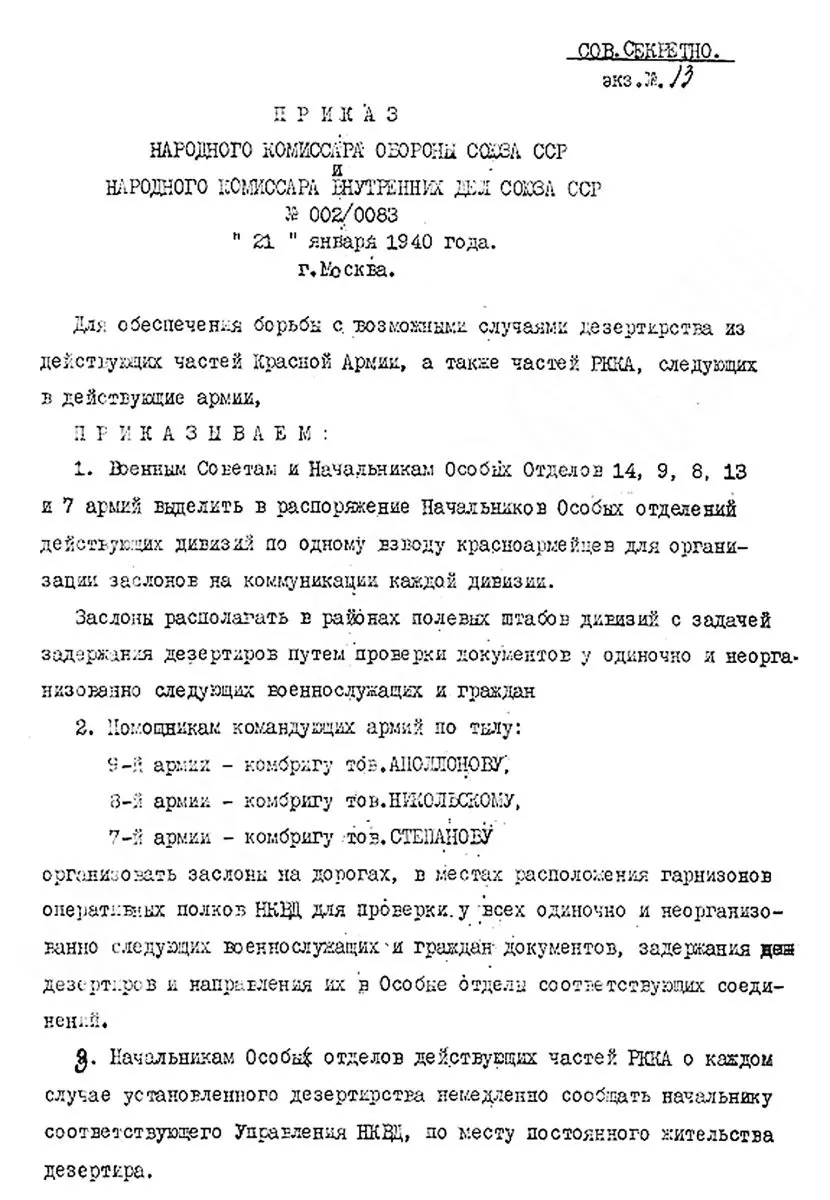 Оба – с разрывом всего в три дня. Приказ № 002/0083 (первая цифра – нумерация по линии Наркомата обороны, вторая – по линии НКВД) от 21 января 1940 года начинается примечательно: «Для обеспечения борьбы с возможными случаями дезертирства из действующих частей Красной Армии, а также частей РККА, следующих в действующие армии…». Далее, собственно, приказ о выделении в распоряжение особистов каждой из воюющих дивизий по взводу красноармейцев «для организации заслонов на коммуникации каждой дивизии <…> с задачей задержания дезертиров…».