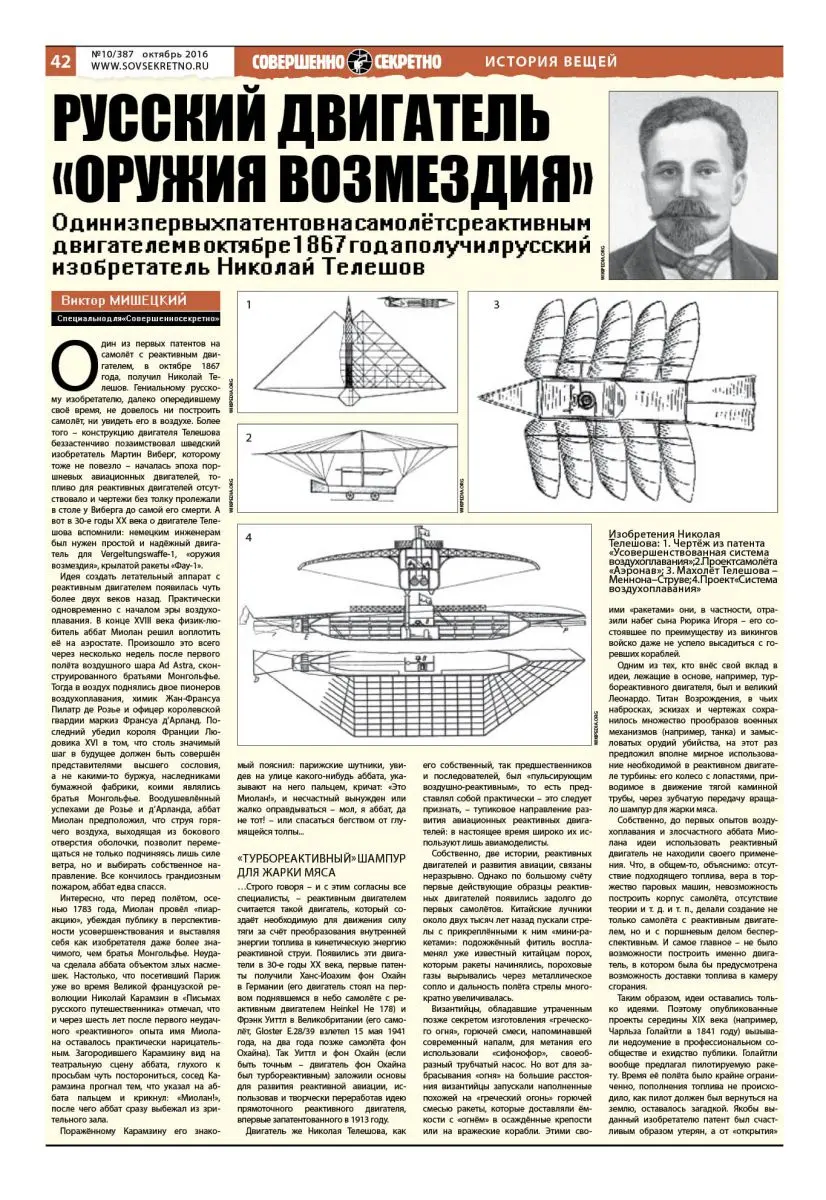 …Николай Афанасьевич Телешов запатентовал свой самолёт с реактивным двигателем на два года позже де Луврье, в 1867 году. Можно спорить о приоритетах, но главное по большому счёту не они, а то, что самолёт Телешова, в отличие от «Аэронава», вполне мог бы, при некоторых условиях, стать первым поднявшимся в небо реактивным самолётом.