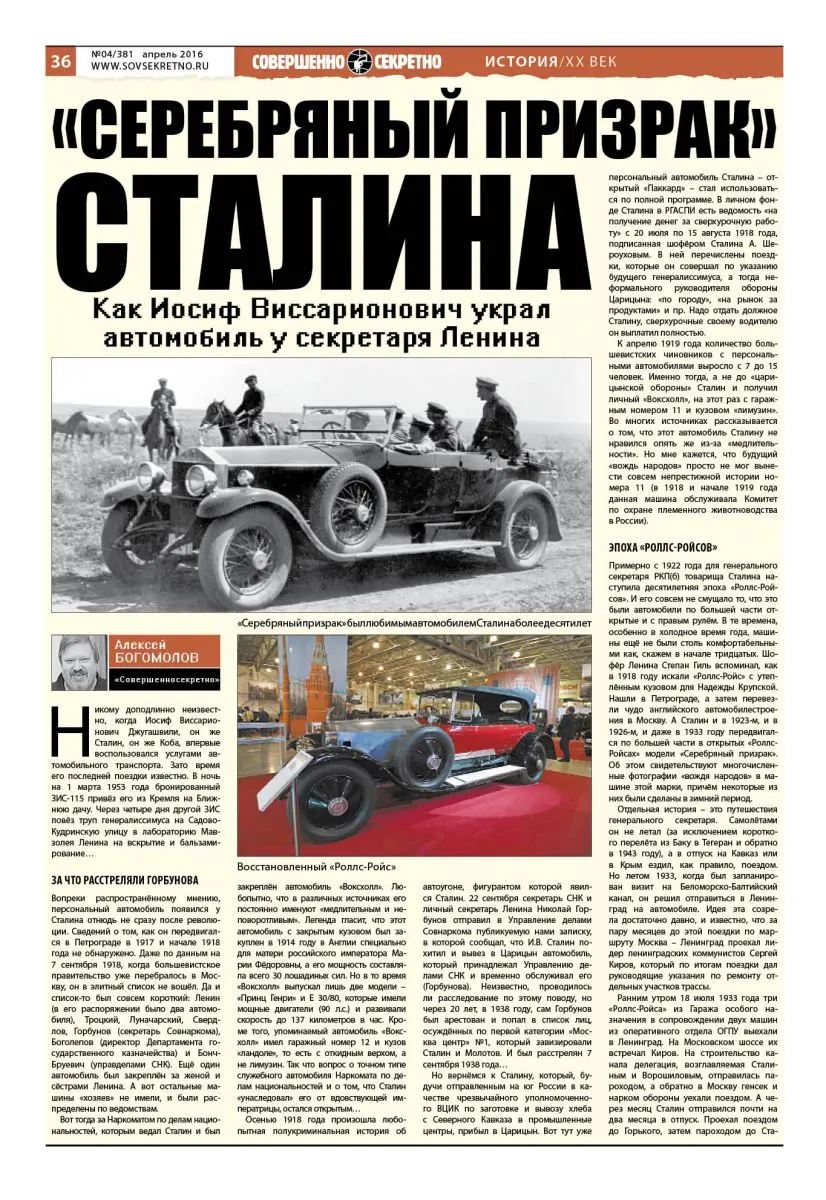 Примерно с 1922 года для генерального секретаря РКП(б) товарища Сталина наступила десятилетняя эпоха «Роллс-Ройсов». И его совсем не смущало то, что это были автомобили по большей части открытые и с правым рулём. В те времена, особенно в холодное время года, машины ещё не были столь комфортабельными как, скажем в начале тридцатых. Шофёр Ленина Степан Гиль вспоминал, как в 1918 году искали «Роллс-Ройс» с утеплённым кузовом для Надежды Крупской. Нашли в Петрограде, а затем перевезли чудо английского автомобилестроения в Москву. А Сталин и в 1923-м, и в 1926-м, и даже в 1933 году передвигался по большей части в открытых «Роллс-Ройсах» модели «Серебряный призрак». Об этом свидетельствуют многочисленные фотографии «вождя народов» в машине этой марки, причём некоторые из них были сделаны в зимний период