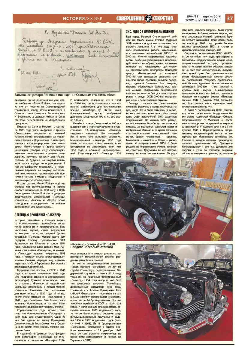 В изданной литературе часто фигурирует фотография «Паккарда» со спецсигналом и подписью: «Паккард» США. И приводится пояснение, что с 1934 по 1946 год он использовался как основной автомобиль для обслуживания членов Политбюро ЦК ВКП(б). Имел бронированный кузов, V-образный двигатель мощностью 400 л. с., вес около 6 тонн».
