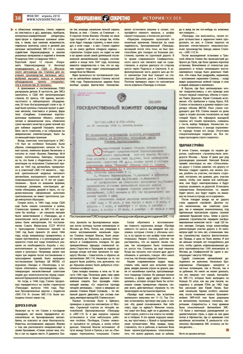 Легенда о «полностью отечественном» лимузине родилась в конце сороковых годов, когда ЗИСы были запущены в серию, но не стали массовыми (всего было выпущено 2089 автомобилей ЗИС различных модификаций). Но именно тогда развернулась кампания борьбы против космополитизма, за приоритет советской науки и изобретений. Именно в то время Яблочков стал изобретателем электрической лампочки, братья Черепановы – паровоза, Можайский – самолёта, а Попов – радиосвязи. И монументальный ЗИС-110 было решено по определению считать абсолютно советским. Документы по его изготовлению, включая постановления Государственного комитета обороны, были строго засекречены. А бронированная версия, как мне рассказывал бывший начальник Гаража особого назначения Юрий Ланин, была секретной до 1982 года, причём больше десятка автомобилей ЗИС-115 стояли в кремлёвском гараже тридцать лет!