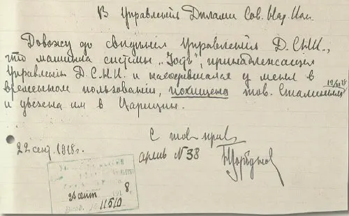 Осенью 1918 года произошла любопытная полукриминальная история об автоугоне, фигурантом которой явился Сталин. 22 сентября секретарь СНК и личный секретарь Ленина Николай Горбунов отправил в Управление делами Совнаркома публикуемую нами записку, в которой сообщал, что И.В. Сталин похитил и вывез в Царицын автомобиль, который принадлежал Управлению делами СНК и временно обслуживал его (Горбунова). Неизвестно, проводилось ли расследование по этому поводу, но через 20 лет, в 1938 году, сам Горбунов был арестован и попал в список лиц, осуждённых по первой категории «Москва центр» №1, который завизировали Сталин и Молотов. И был расстрелян 7 сентября 1938 года…