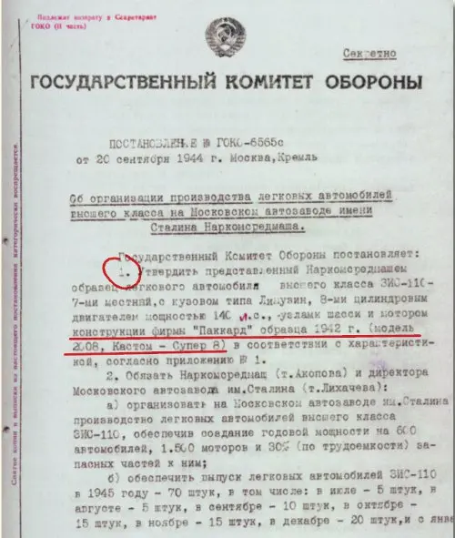 Секретное постановление ГОКО №6565с от 20 сентября 1944 года, хранящееся в Российском государственном архиве социально-политической истории, проливает свет на то, каким именно образом появился на свет этот «отечественный» лимузин. Уже первый пункт был предельно откровенен: «Государственный комитет обороны постановляет: Утвердить представленный Наркомсредмашем образец легкового автомобиля ЗИС-110 – 7-ми местный с кузовом типа Лимузин, 8-цилиндровым двигателем мощностью 140 л.с., узлами и мотором конструкции фирмы «Паккард» образца 1942 г. (модель 2008 Кастом-Супер 8) в соответствии с характеристикой, согласно приложению №1».