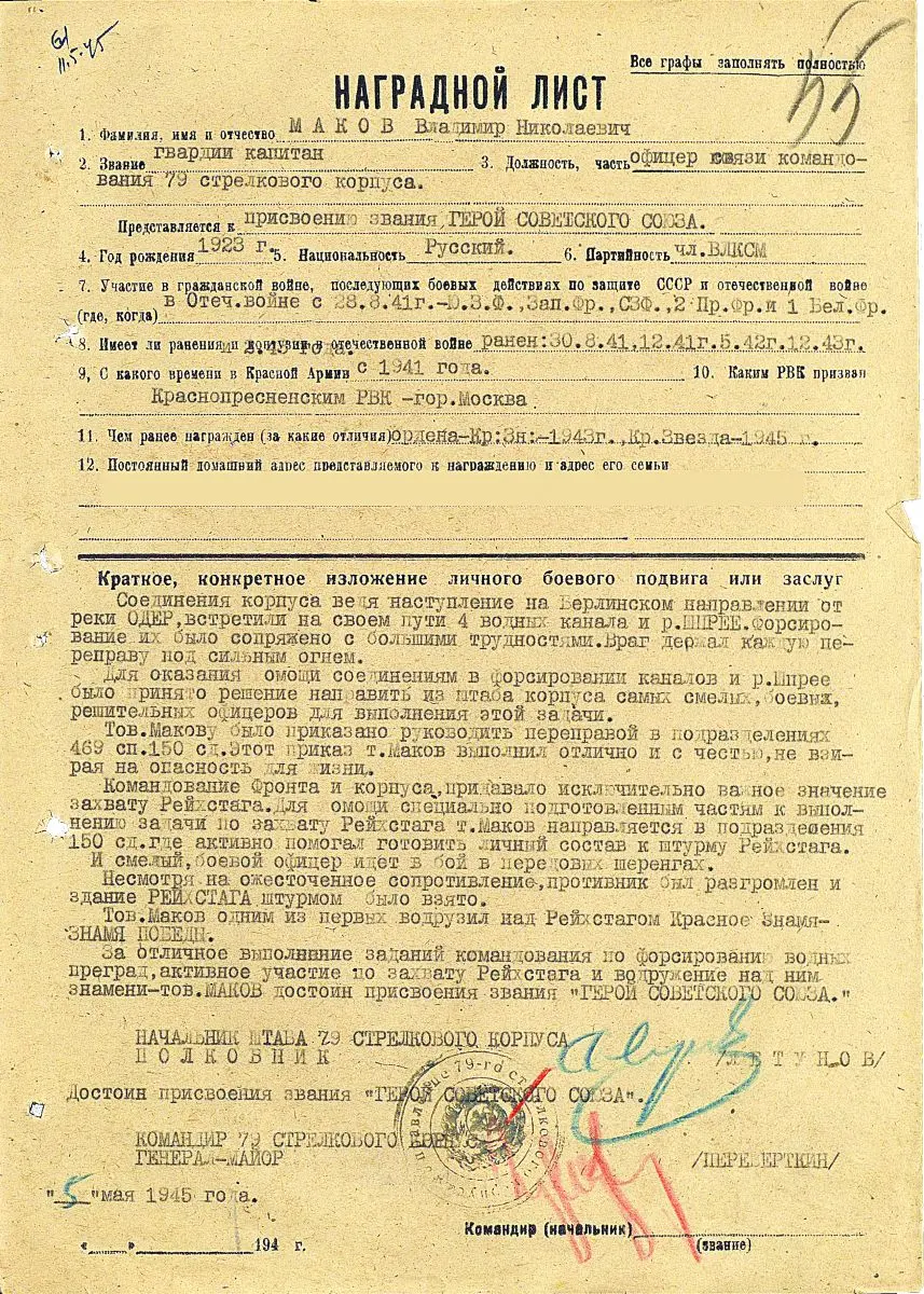 За отличное выполнение заданий командования по форсированию водных преград, активное участие по захвату Рейхстага и водружение над ним знамени – тов. МАКОВ достоин присвоения звания «ГЕРОЙ СОВЕТСКОГО СОЮЗА».