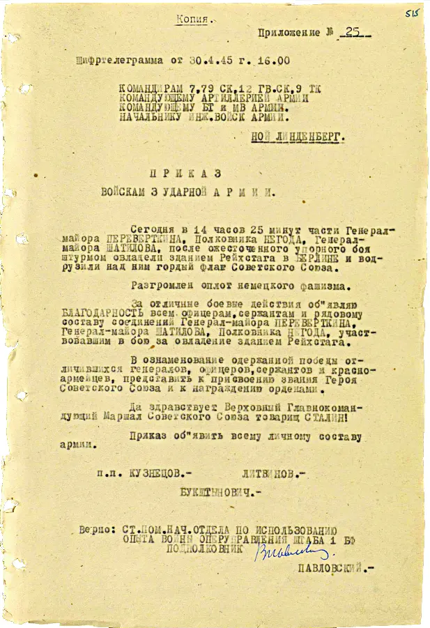 2. Войска 3-й Ударной армии генерал-полковника КУЗНЕЦОВА, продолжая наступление, сломили сопротивление врага, заняли главное здание РЕЙХСТАГА и сегодня 30.4.45 г. в 14.25 подняли на нем наш Советский флаг. В боях за район и главное здание РЕЙХСТАГА отличился 79 ск (стрелковый корпус. – Ред.) генерал-майора ПЕРЕВЁРТКИНА и его 171 сд (стрелковая дивизия. – Ред.) полковника НЕГОДА и 150 сд – генерал-майора ШАТИЛОВА…»