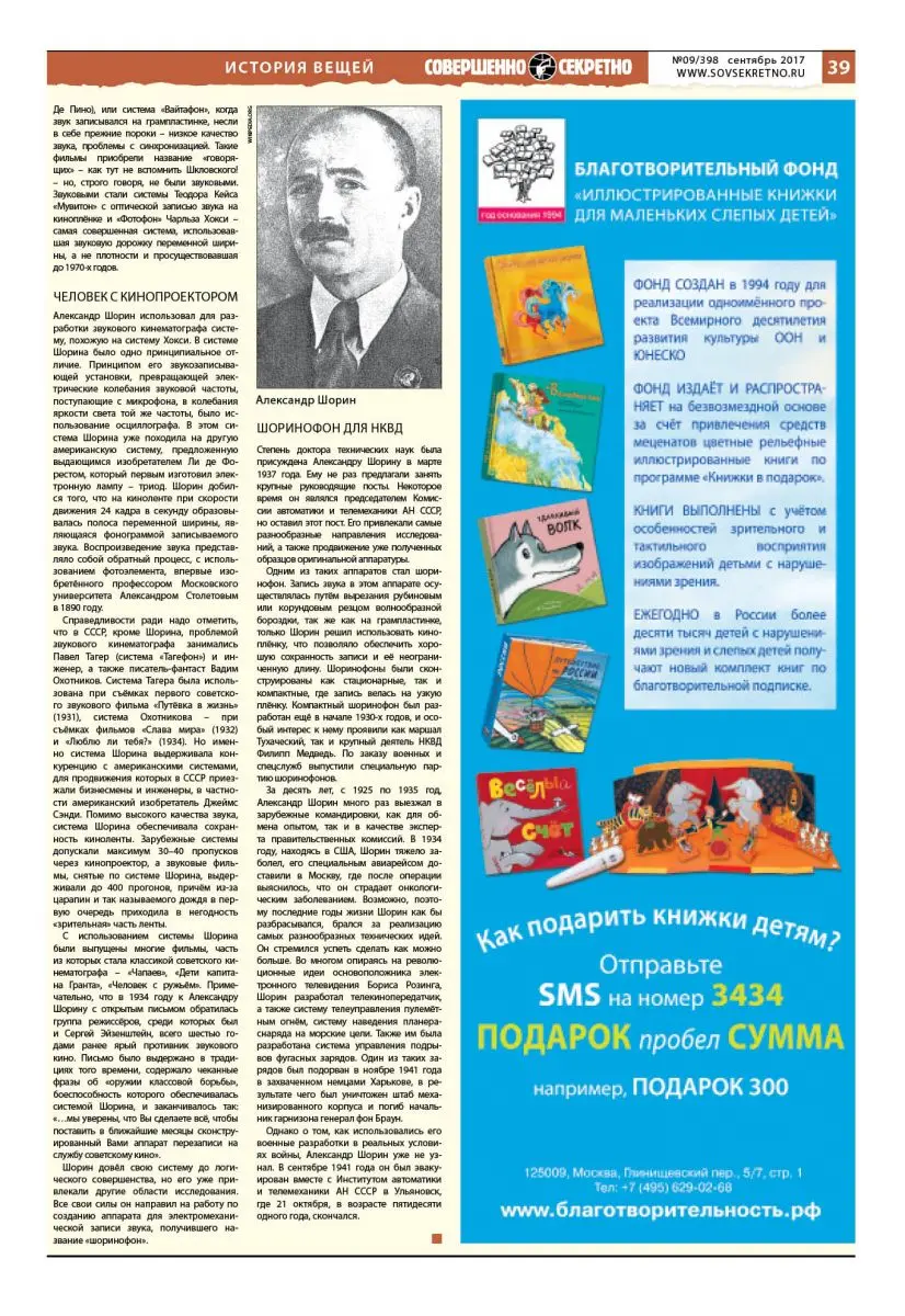 Александр Шорин родился за четыре года до первого опыта по созданию звукового кинематографа. В автобиографии, уже в советское время, он написал – «в семье крестьянина-бедняка». Шорин был непрост, он прекрасно понимал правила игры, навязанные большевиками: главное – это происхождение. На самом деле его отец, Фёдор Григорьевич, хоть и происходил из крестьянской семьи, но с 1889 года служил учётчиком на лесном складе Варшавской железной дороги, то есть крестьянином-бедняком отнюдь не был. К тому же автобиография была написана Шориным в конце 1930-х годов. Беспартийному учёному (а в прошлом офицеру царской армии), неоднократно бывавшему в заграничных служебных командировках, многие коллеги которого были расстреляны как враги народа, акцент на «нужном» происхождении должен был помочь избежать подозрений в неблагонадёжности. Это была попытка найти защиту в обстановке тотальной подозрительности и массовых репрессий. Хотя бдительность органов вряд ли удалось обмануть – Шорин избежал преследований не только и не столько потому, что стал изобретателем одного из типов отечественного звукового кинематографа. Его исследовательская деятельность была так широка, что распространялась на приборы и устройства, которыми могли воспользоваться и военные, и работники НКВД. Дистанционно управляемые взрывные устройства, управляемые по радио танки, мощные усилители, один из первых в мире компактных диктофонов – это всё Шорин, русский Эдисон…