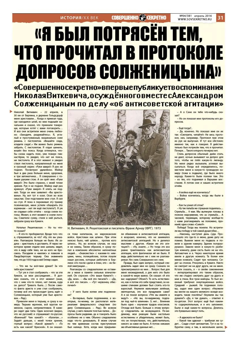 К сожалению, материалов уголовного дела, по которым «пошли друзья-заговорщики», никто не видел. Есть даже предположения, что дело могло быть уничтожено (об этом, например, корреспонденту «Совершенно секретно» рассказали родственники Решетовской). Между тем про арест, следствие и лагерные годы «заговорщики» рассказали отдельно. Солженицын – в художественной прозе, а Виткевич – в интервью, которое газета «Совершенно секретно»