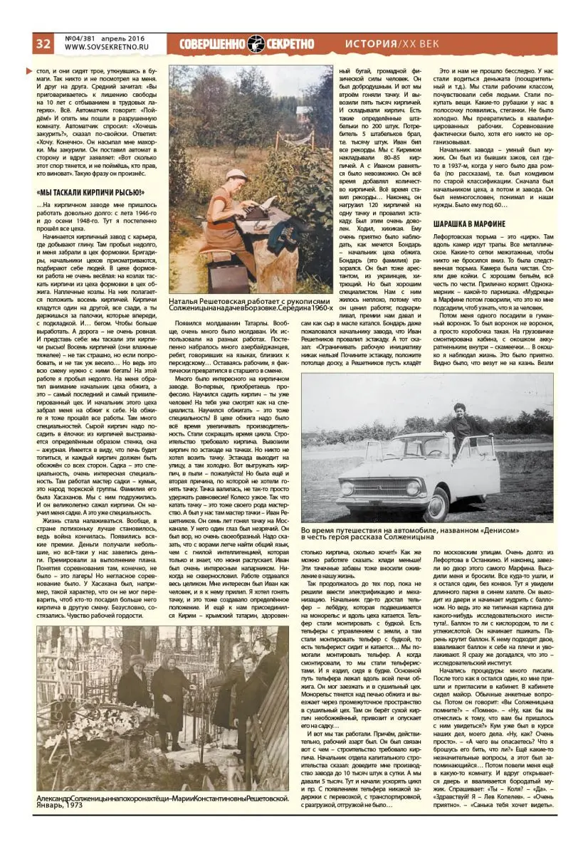 В нашей газетной публикации мы приводим основные эпизоды, касающиеся ареста Виткевича, а также его работы на кирпичном «гулаговском» заводе и в «шарашке» Марфино. Другие главы этого масштабного интервью, записанного Решетовской, содержат воспоминания Николая Виткевича о том, как этапировали заключённых из послевоенной Европы к местам лишения свободы, о том, как тяжело он выживал в лагерях Республики Коми. Этот богатый подробностями документальный материал будет полностью опубликован на сайте нашей газеты.
