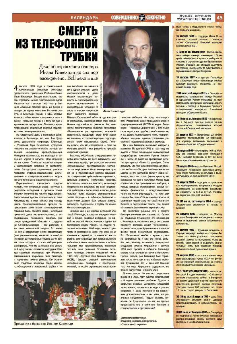 4 августа 1995 года в Центральной клинической больнице скончался председатель правления Росбизнесбанка Иван Кивелиди. Вскоре выяснилось, что его отравили неким экзотическим ядом. Началось всё 1 августа 1995 года: у банкира обычный рабочий день, но ближе к вечеру он теряет сознание. Вызвали скорую, и Кивелиди увезли в ЦКБ. Острые колики с обмороками случались у него и ранее – больные почки, а к тому же ещё и хроническая гипертония. Поначалу врачи подозревали обширный инсульт, пациента поместили в реанимацию.