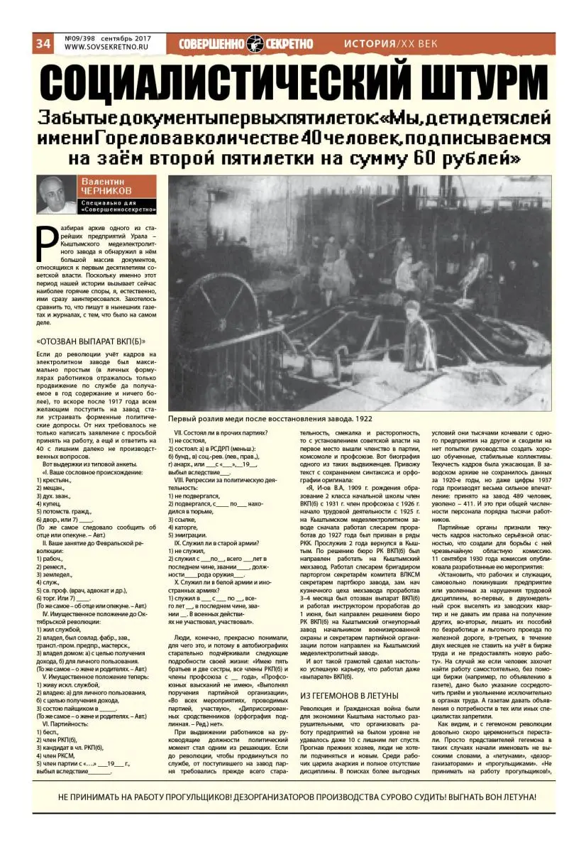 При выдвижении работников на руководящие должности политический момент стал одним из решающих. Если до революции, чтобы продвинуться по службе, от поступившего на завод парня требовались прежде всего старательность, смекалка и расторопность, то с установлением советской власти на первое место вышли членство в партии, комсомоле и профсоюзе. Вот биография одного из таких выдвиженцев. Привожу текст с сохранением синтаксиса и орфографии оригинала: «Я, И-ов В.А, 1909 г. рождения образование 2 класса начальной школы член ВКП(б) с 1931 г. член профсоюза с 1926 г. начало трудовой деятельности с 1925 г. на Кыштымском медеэлектролитном заводе сначала работал слесарем проработав до 1927 года был призван в ряды РКК. Прослужив 2 года вернулся в Кыштым. По решению бюро РК ВКП(б) был направлен работать на Кыштымский мехзавод. Работал слесарем бригадиром парторгом секретарём комитета ВЛКСМ секретарем партбюро завода, зам. нач кузнечного цеха мехзавода проработав 3–4 месяца был отозван выпарат ВКП(б) и работал инструктором проработав до 1 июня, был направлен решением бюро РК ВКП(б) на Кыштымский огнеупорный завод начальником военизированной охраны и секретарем партийной организации потом направлен на Кыштымский медеэлектролитный завод»