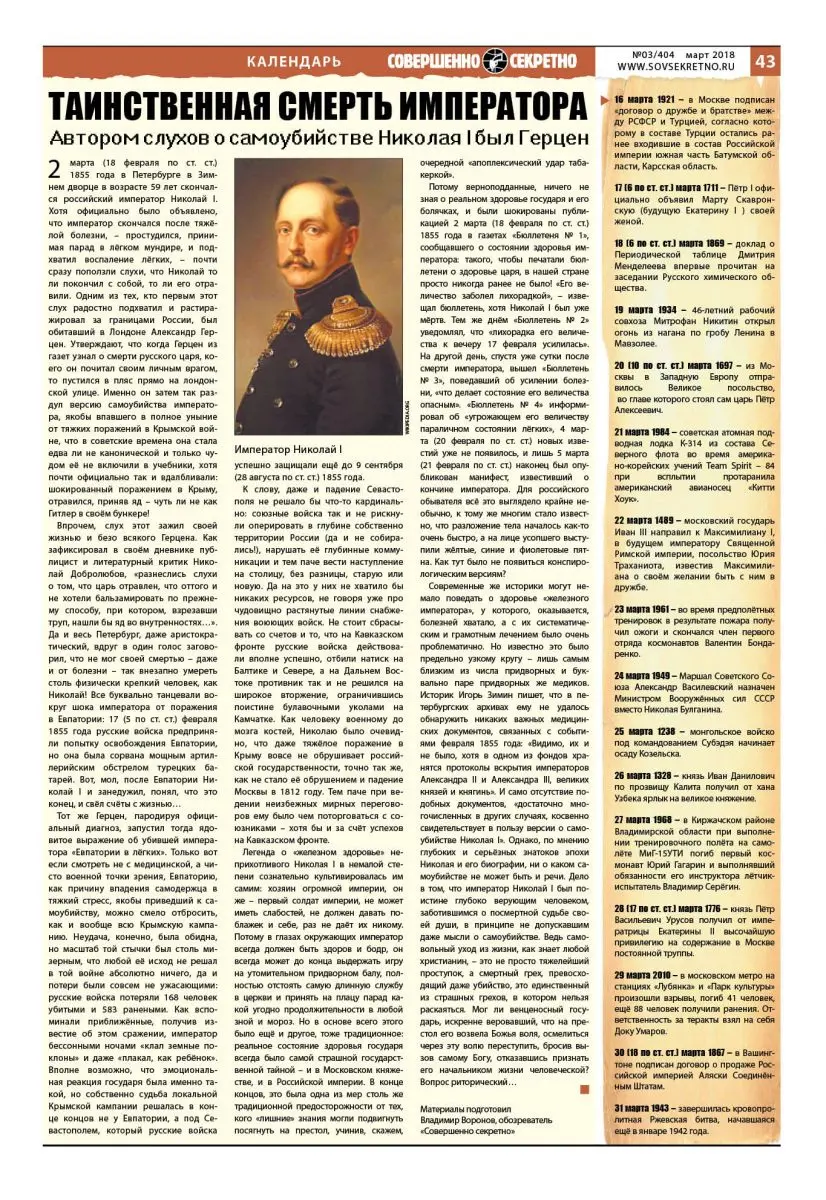2 марта (18 февраля по ст. ст.) 1855 года в Петербурге в Зимнем дворце в возрасте 59 лет скончался российский император Николай I. Хотя официально было объявлено, что император скончался после тяжёлой болезни, – простудился, принимая парад в лёгком мундире, и подхватил воспаление лёгких, – почти сразу поползли слухи, что Николай то ли покончил с собой, то ли его отравили. Одним из тех, кто первым этот слух радостно подхватил и растиражировал за границами России, был обитавший в Лондоне Александр Герцен. Утверждают, что когда Герцен из газет узнал о смерти русского царя, коего он почитал своим личным врагом, то пустился в пляс прямо на лондонской улице. Именно он затем так раздул версию самоубийства императора, якобы впавшего в полное уныние от тяжких поражений в Крымской войне, что в советские времена она стала едва ли не канонической и только чудом её не включили в учебники, хотя почти официально так и вдалбливали: шокированный поражением в Крыму, отравился, приняв яд – чуть ли не как Гитлер в своём бункере!