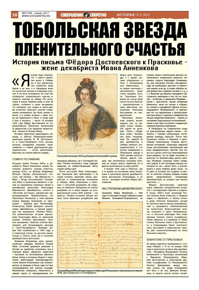 «Я всегда буду помнить, что с самого прибытия моего в Сибирь вы и всё превосходное семейство ваше брали и во мне, и в товарищах моих по несчастью полное и искреннее участие. Я не могу вспоминать об этом без особенного, утешительного чувства и, кажется, никогда не забуду. Кто испытывал в жизни тяжёлую долю и знал её горечь, особенно в иные мгновения, тот понимает, как сладко в такое время встретить братское участие совершенно неожиданно. Вы были таковы со мною, и я помню встречу с вами, когда вы приезжали в Омск, и когда ещё я был в каторге», – писал 18 октября 1855 года Фёдор Достоевский из Семипалатинска Прасковье Анненковой (в девичестве и до принятия православия – Жаннетта Полина Гёбль).