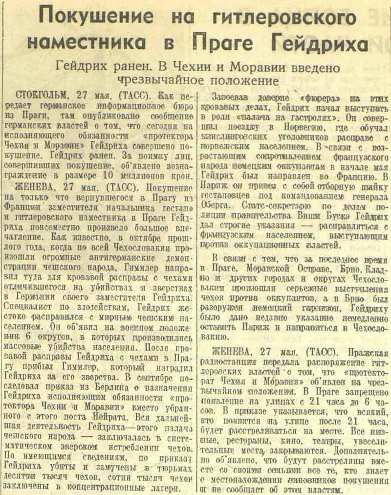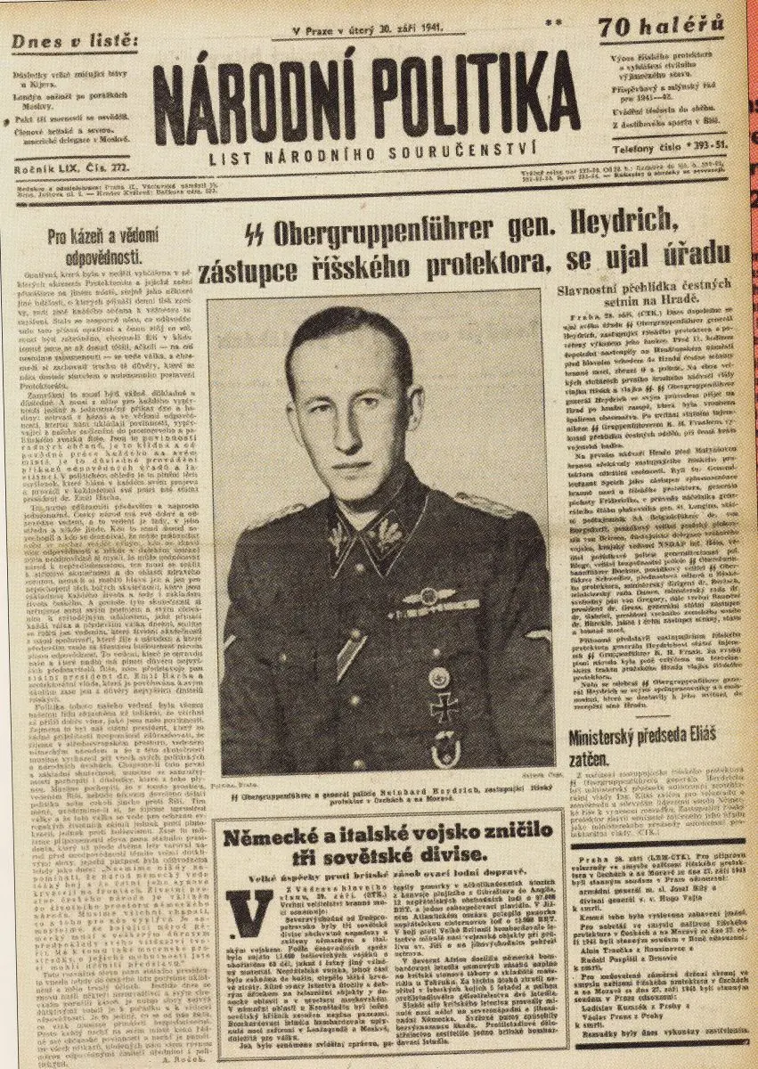 ОБЪЯВЛЕНИЕ О ВСТУПЛЕНИИ ГЕЙДРИХА В ДОЛЖНОСТЬ РЕЙХСПРОТЕКТОРА В ЧЕШСКОЙ ГАЗЕТЕ «НАРОДНА ПОЛИТИКА» (СЛЕВА) И СООБЩЕНИЕ О ПОКУШЕНИИ НА ГЕЙДРИХА В «КРАСНОЙ ЗВЕЗДЕ»