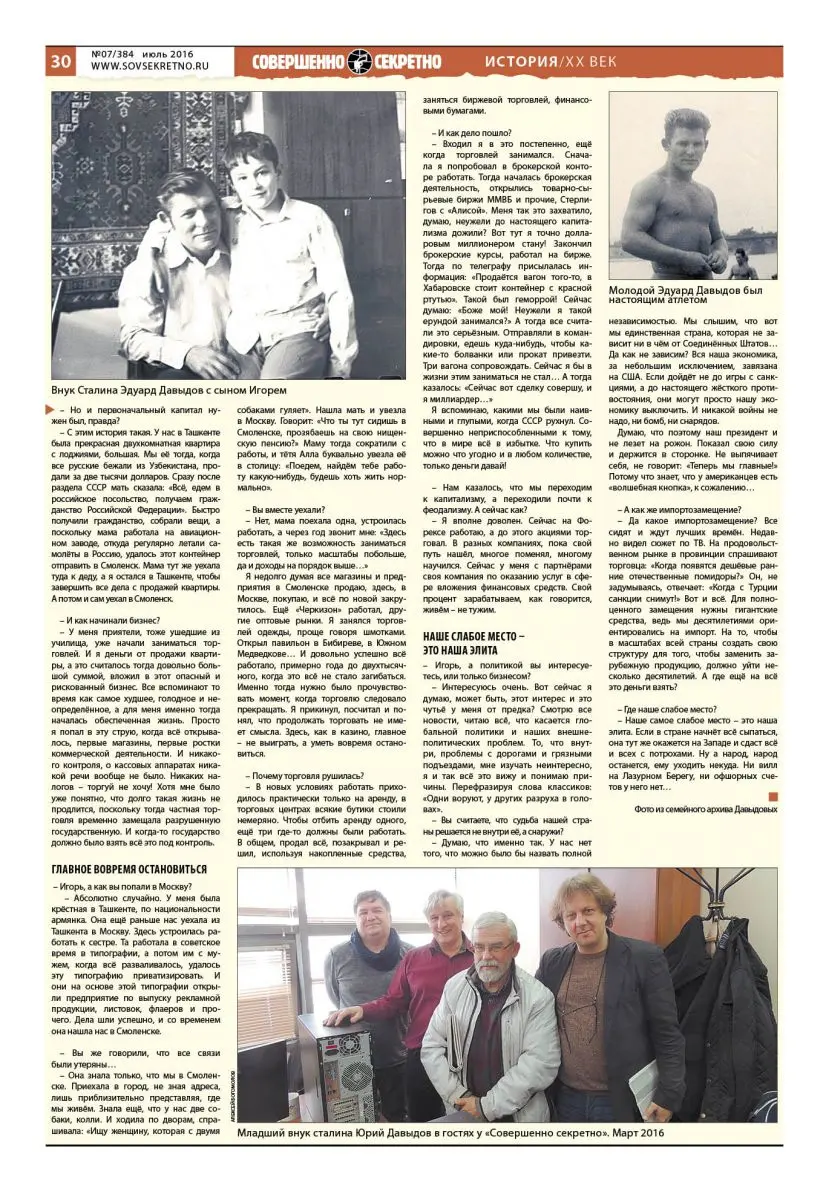 Именно тогда я познакомился с Юрием Давыдовым, живущим и работающим в далёком от Москвы Новокузнецке. А через несколько дней сотрудники редакции передали мне телефон Игоря Эдуардовича Давыдова, который очень просил меня позвонить. Но я решил подстраховаться и спросить у реального внука Сталина Юрия Давыдова, известен ли ему человек с такими данными. Он буквально закричал в трубку: «Да это же Игорь, сын моего покойного старшего брата Эдика! Мы с ним не виделись больше двадцати лет – потеряли связь во время распада СССР». Остальное было делом техники: родственники связались по телефону, потом встретились в Москве, а я получил возможность сделать самое первое интервью с московским правнуком Иосифа Сталина, который в свои 46 лет является довольно успешным бизнесменом, причём взгляды его на жизнь и политику весьма отличаются от тех, которые прививал нашей стране его прадед.