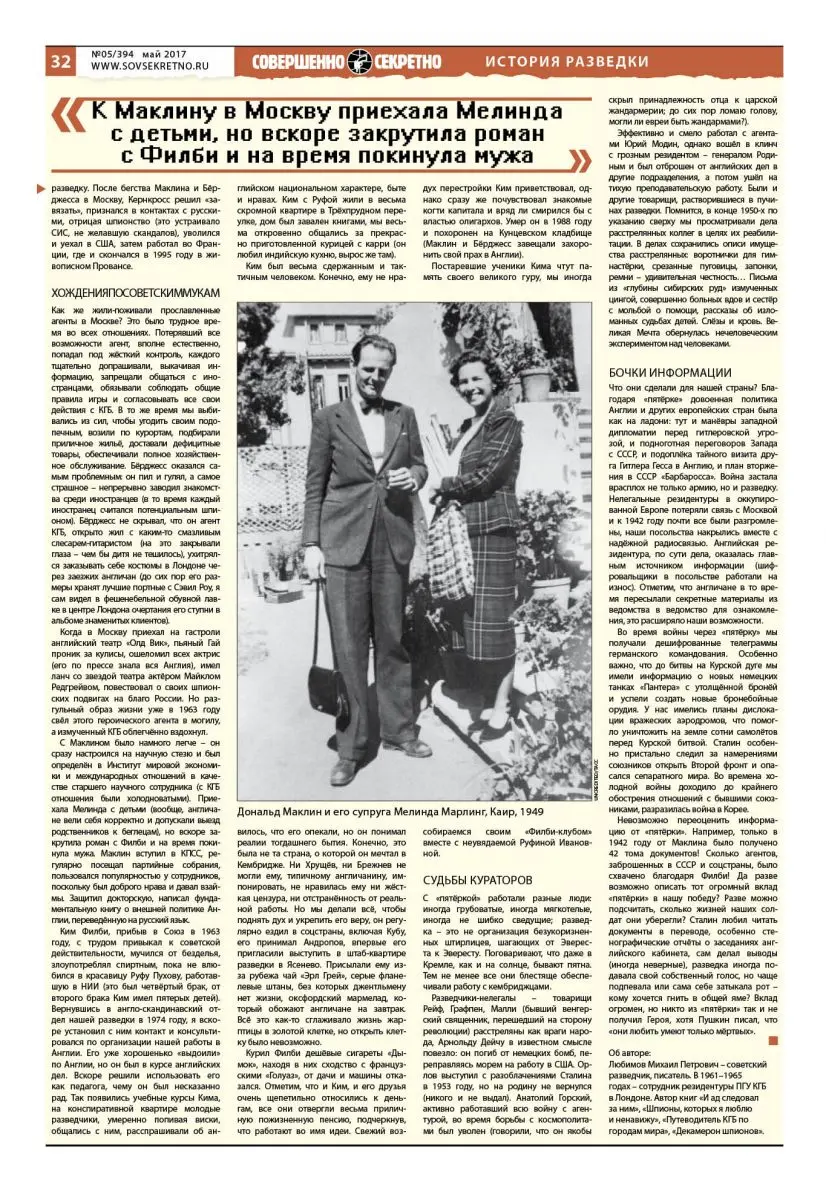 С Маклином было намного легче – он сразу настроился на научную стезю и был определён в Институт мировой экономики и международных отношений в качестве старшего научного сотрудника (с КГБ отношения были холодноватыми). Приехала Мелинда с детьми (вообще, англичане вели себя корректно и допускали выезд родственников к беглецам), но вскоре закрутила роман с Филби и на время покинула мужа. Маклин вступил в КПСС, регулярно посещал партийные собрания, пользовался популярностью у сотрудников, поскольку был доброго нрава и давал взаймы. Защитил докторскую, написал фундаментальную книгу о внешней политике Англии, переведённую на русский язык.