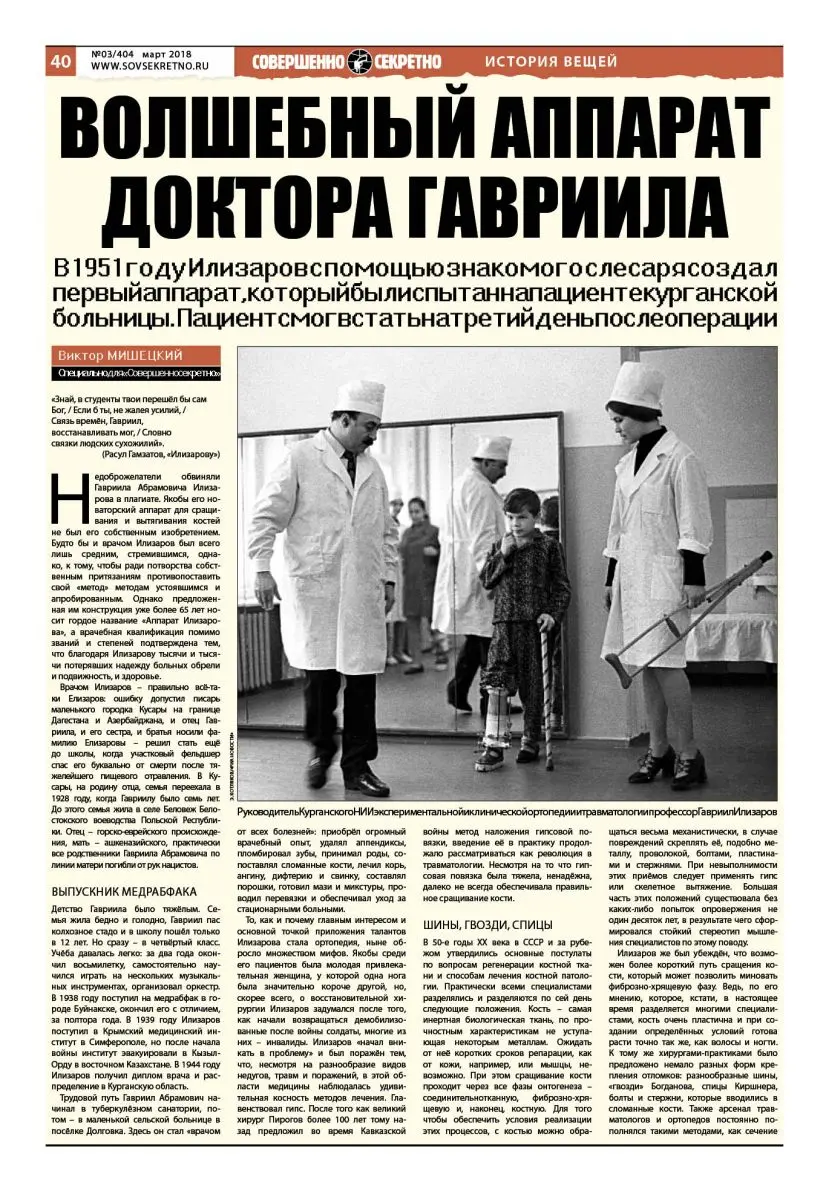 Влиятельный профессиональный журнал BulletinoftheHospitalforJointDiseases в 2013 году опубликовал статью, в которой даётся обзор методов ортопедии и травматологии и утверждается, что метод Гавриила Илизарова – практически единственный дающий не только возможности излечения, но и формирующий новые теоретические представления. Это действительно так.