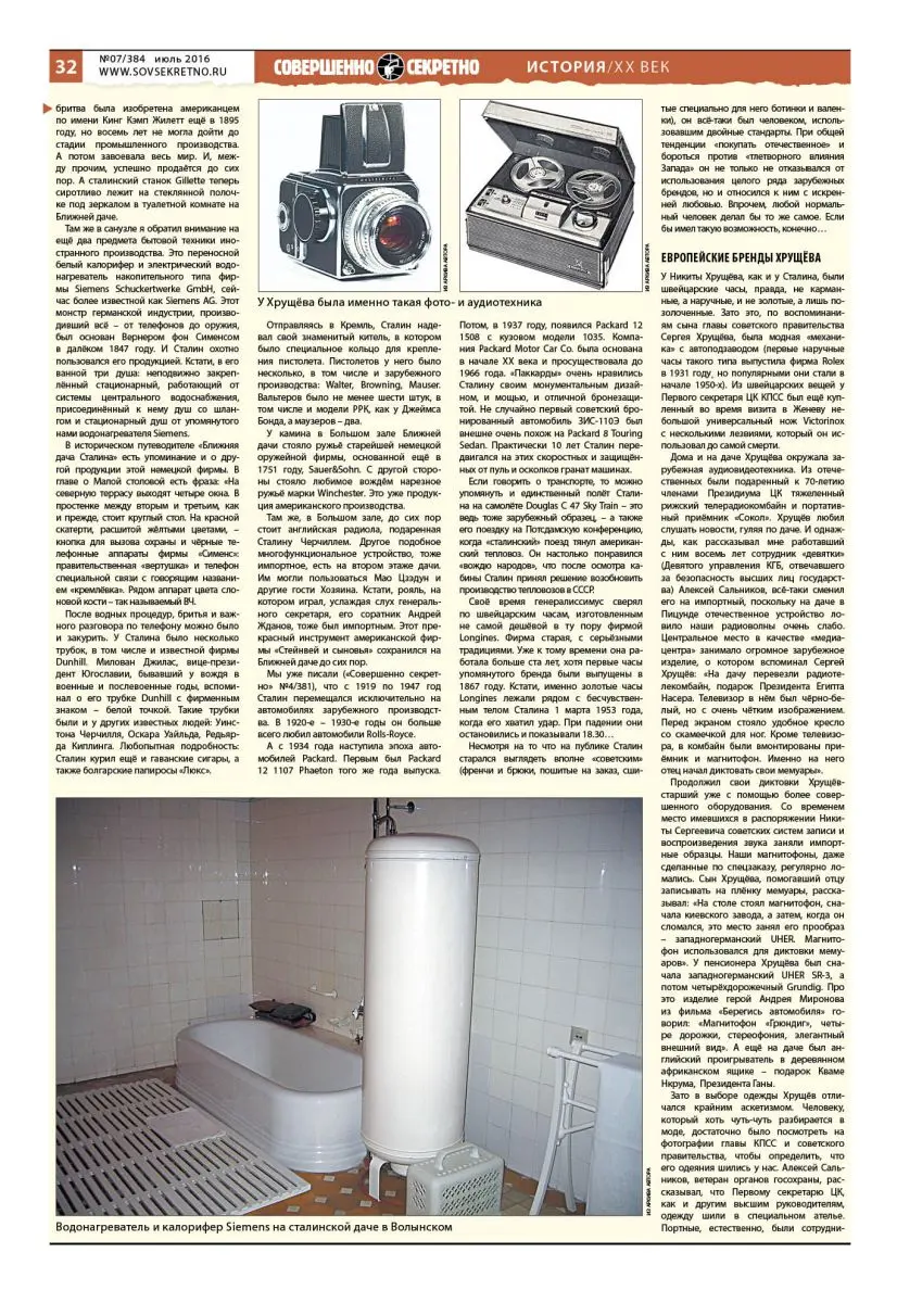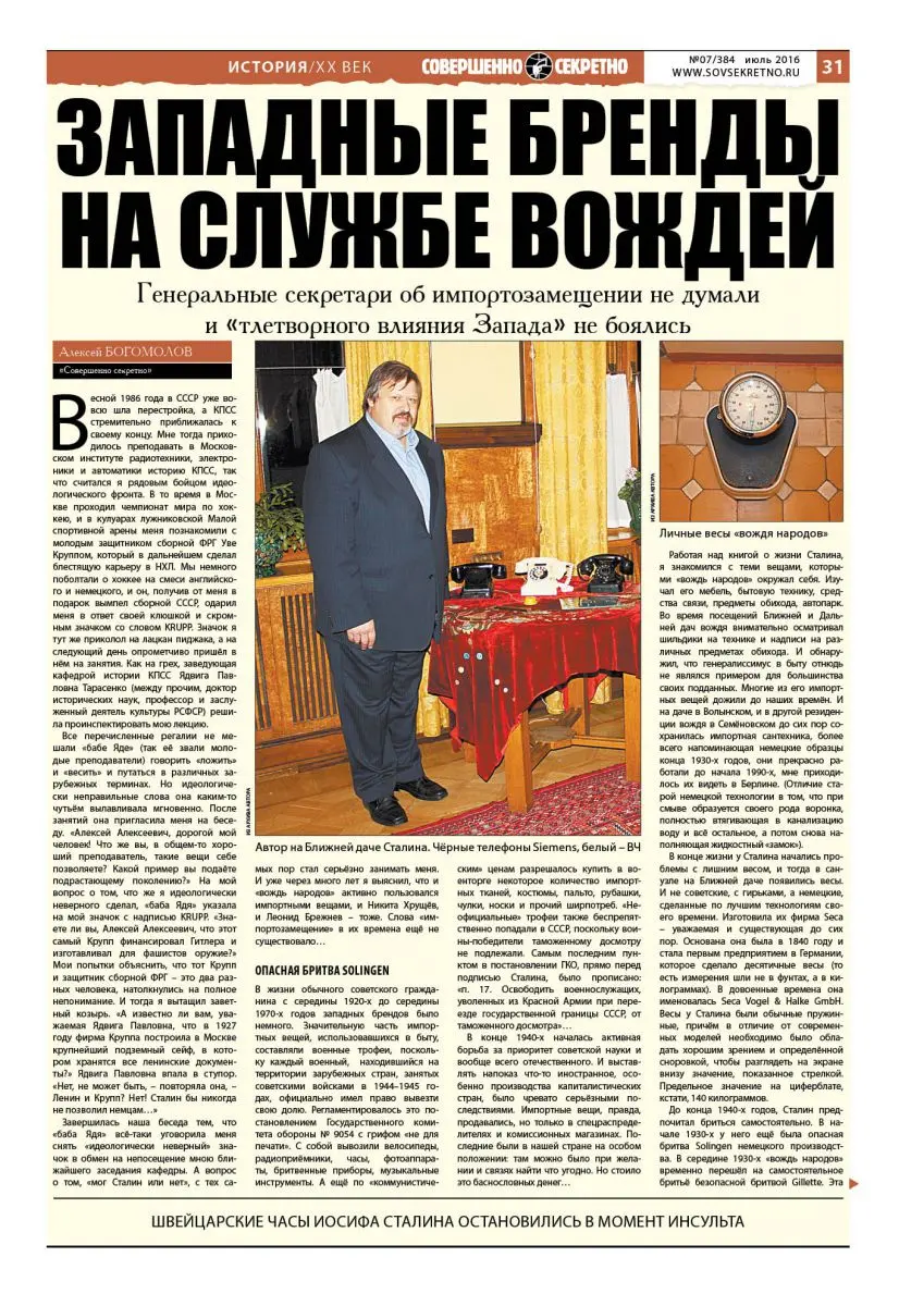 Работая над книгой о жизни Сталина, я знакомился с теми вещами, которыми «вождь народов» окружал себя. Изучал его мебель, бытовую технику, средства связи, предметы обихода, автопарк. Во время посещений Ближней и Дальней дач вождя внимательно осматривал шильдики на технике и надписи на различных предметах обихода. И обнаружил, что генералиссимус в быту отнюдь не являлся примером для большинства своих подданных. Многие из его импортных вещей дожили до наших времён. И на даче в Волынском, и в другой резиденции вождя в Семёновском до сих пор сохранилась импортная сантехника, более всего напоминающая немецкие образцы конца 1930-х годов, они прекрасно работали до начала 1990-х, мне приходилось их видеть в Берлине. (Отличие старой немецкой технологии в том, что при смыве образуется своего рода воронка, полностью втягивающая в канализацию воду и всё остальное, а потом снова наполняющая жидкостный «замок»)