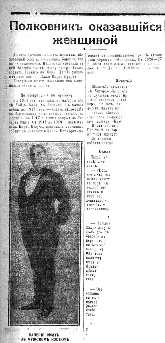 Насколько правдива эта история о полковнике Баркере, мы, видимо, никогда не узнаем. Как, впрочем, и многое остальное, хотя после своего освобождения из тюрьмы женщина-полковник несколько раз продавала свою историю популярным журналам. Судя по тому, что там было изложено, ее настоящее имя – Лилиан Ирма Валери Баркер. Она родилась в 1895 году. Ее отец хотел иметь сына, а потому учил свою дочь боксу, фехтованию, вождению машины и игре в крикет. Во время Первой мировой войны Баркер вступила в канадский военный кавалерийский союз, а затем вышла замуж за Гарольда Аркеля Смита. Сперва газеты сообщали, что ее муж погиб в бою, но затем выяснилось, что она вроде бы просто вскоре с ним рассталась.