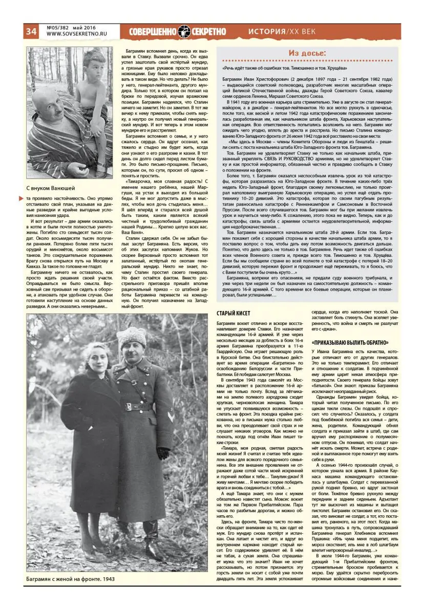 Тов. Баграмян назначается начальником штаба 28-й армии. Если тов. Баграмян покажет себя с хорошей стороны в качестве начальника штаба армии, то я поставлю вопрос о том, чтобы дать ему потом возможность двигаться дальше. Понятно, что дело здесь не только в тов. Баграмяне. Речь идет также об ошибках всех членов Военного совета и, прежде всего тов. Тимошенко и тов. Хрущёва. Если бы мы сообщили стране во всей полноте о той катастрофе с потерей 18–20 дивизий, которую пережил фронт и продолжает ещё переживать, то я боюсь, что с Вами поступили бы очень круто…»