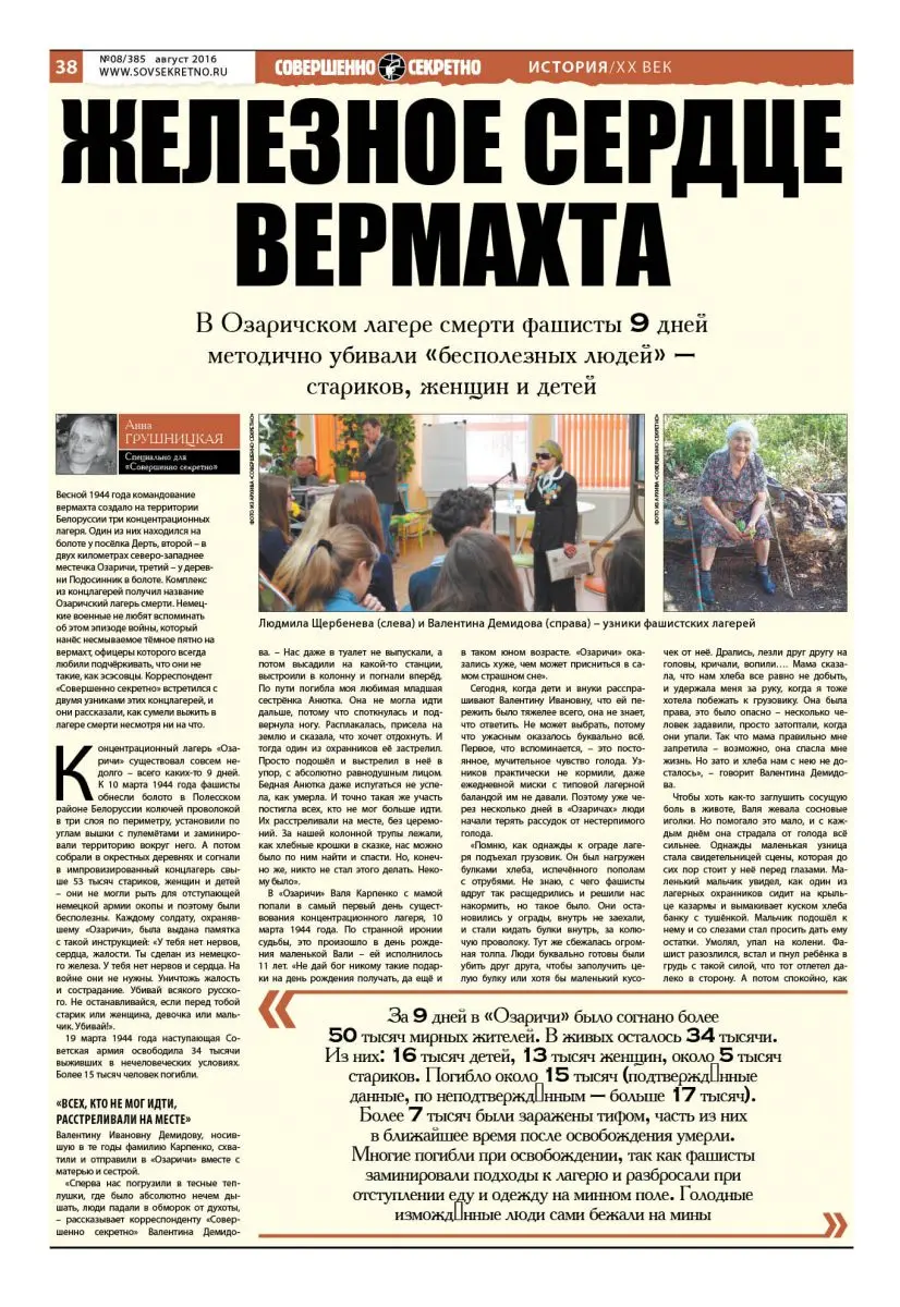 Весной 1944 года командование вермахта создало на территории Белоруссии три концентрационных лагеря. Один из них находился на болоте у посёлка Дерть, второй – в двух километрах северо-западнее местечка Озаричи, третий – у деревни Подосинник в болоте. Комплекс из концлагерей получил название Озаричский лагерь смерти. Немецкие военные не любят вспоминать об этом эпизоде войны, который нанёс несмываемое тёмное пятно на вермахт, офицеры которого всегда любили подчёркивать, что они не такие, как эсэсовцы. Корреспондент «Совершенно секретно» встретился с двумя узниками этих концлагерей, и они рассказали, как сумели выжить в лагере смерти несмотря ни на что.