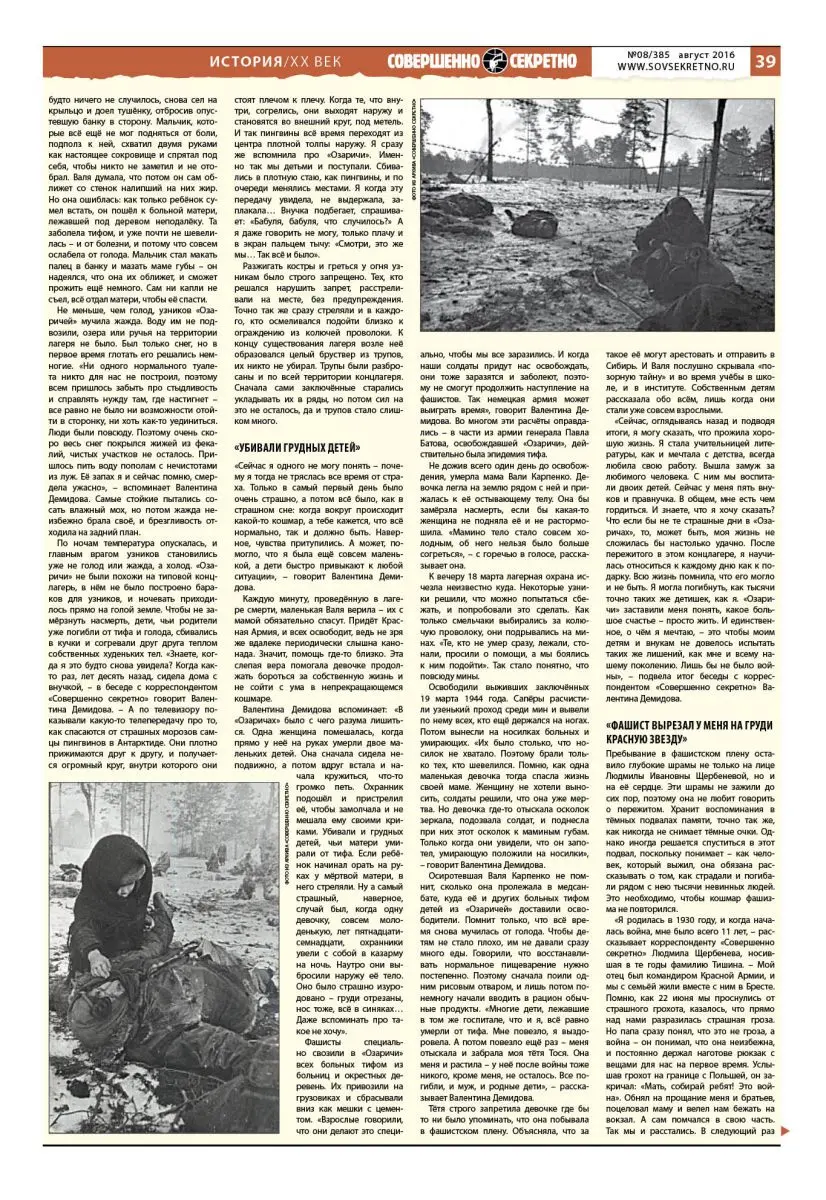 По ночам температура опускалась, и главным врагом узников становились уже не голод или жажда, а холод. «Озаричи» не были похожи на типовой концлагерь, в нём не было построено бараков для узников, и ночевать приходилось прямо на голой земле. Чтобы не замёрзнуть насмерть, дети, чьи родители уже погибли от тифа и голода, сбивались в кучки и согревали друг друга теплом собственных худеньких тел. «Знаете, когда я это будто снова увидела? Когда как-то раз, лет десять назад, сидела дома с внучкой, – в беседе с корреспондентом «Совершенно секретно» говорит Валентина Демидова. – А по телевизору показывали какую-то телепередачу про то, как спасаются от страшных морозов самцы пингвинов в Антарктиде. Они плотно прижимаются друг к другу, и получается огромный круг, внутри которого они стоят плечом к плечу. Когда те, что внутри, согрелись, они выходят наружу и становятся во внешний круг, под метель. И так пингвины всё время переходят из центра плотной толпы наружу. Я сразу же вспомнила про «Озаричи». Именно так мы детьми и поступали. Сбивались в плотную стаю, как пингвины, и по очереди менялись местами. Я когда эту передачу увидела, не выдержала, заплакала… Внучка подбегает, спрашивает: «Бабуля, бабуля, что случилось?» А я даже говорить не могу, только плачу и в экран пальцем тычу: «Смотри, это же мы… Так всё и было».