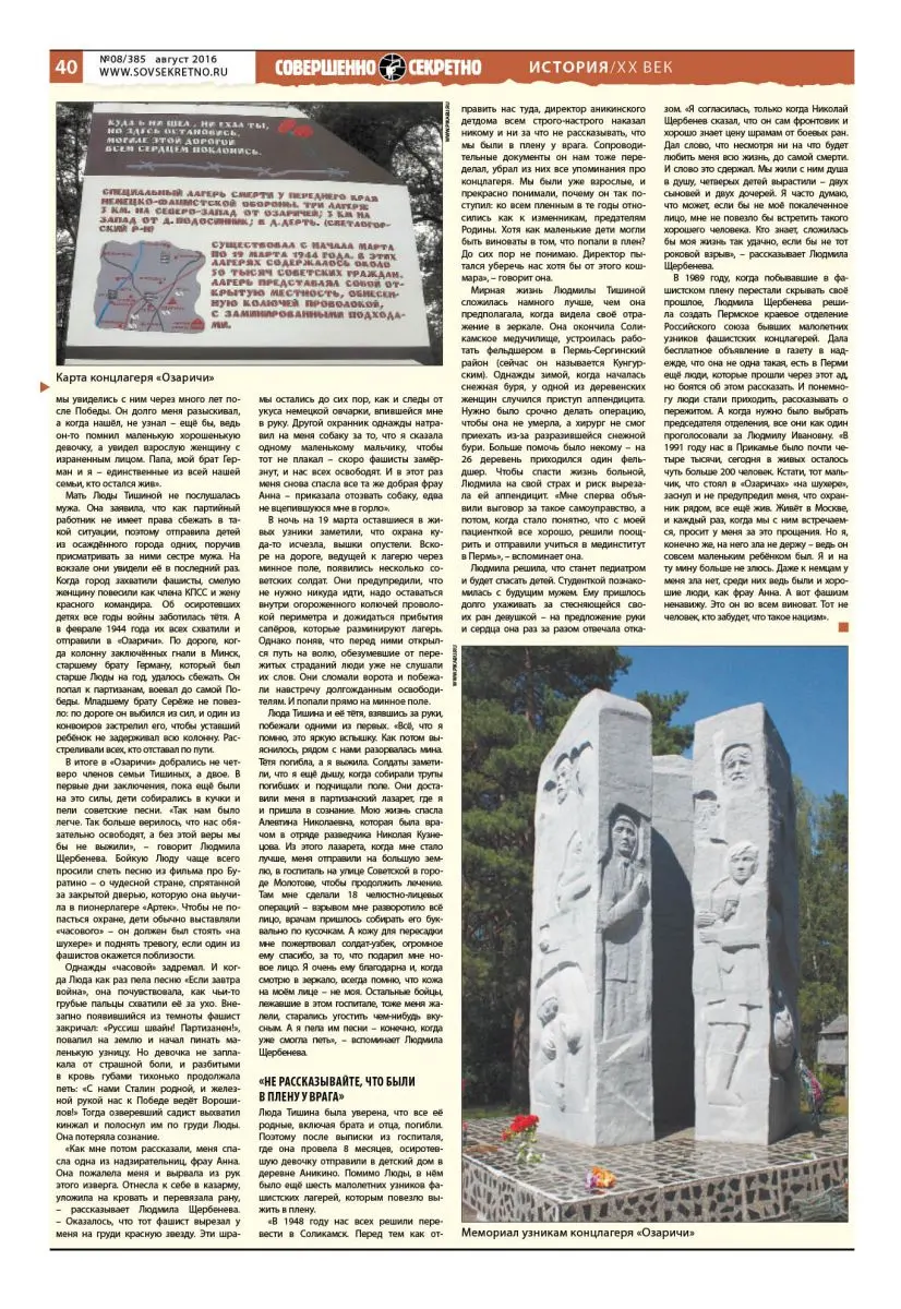 «В 1948 году нас всех решили перевести в Соликамск. Перед тем как отправить нас туда, директор аникинского детдома всем строго-настрого наказал никому и ни за что не рассказывать, что мы были в плену у врага. Сопроводительные документы он нам тоже переделал, убрал из них все упоминания про концлагеря. Мы были уже взрослые, и прекрасно понимали, почему он так поступил: ко всем пленным в те годы относились как к изменникам, предателям Родины. Хотя как маленькие дети могли быть виноваты в том, что попали в плен? До сих пор не понимаю. Директор пытался уберечь нас хотя бы от этого кошмара», – говорит она.