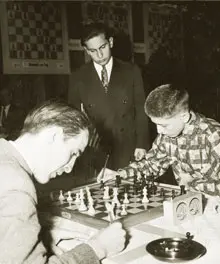 | 1959 год, Цюрих. Таль наблюдает за партией 16-летнего Бобби Фишера. Уже тогда Таль считался претендентом на мировую шахматную корону | |