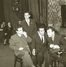 | Михаил Таль среди выдающихся шахматистов (слева направо): Марка Тайманова, Тиграна Петросяна и Виктора Корчного | |