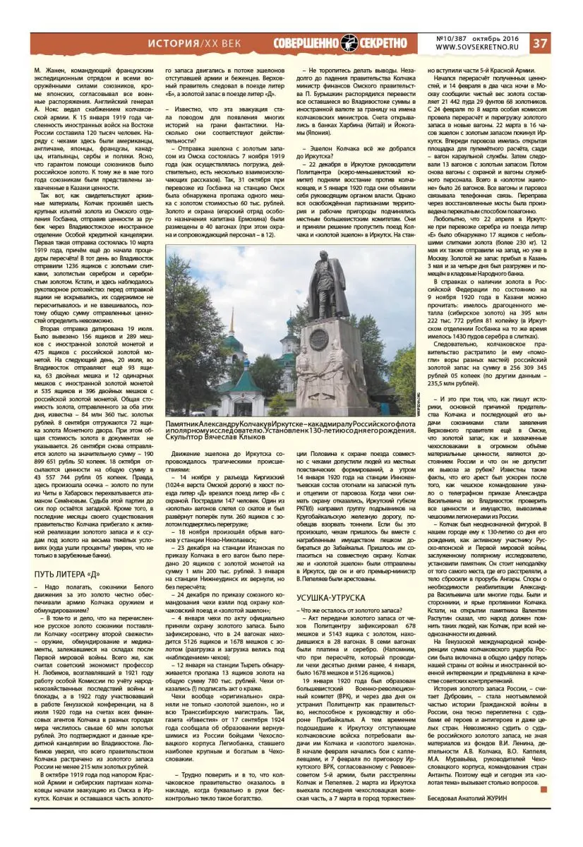 – В том-то и дело, что на перечисленное русское золото союзники поставляли Колчаку «осетрину второй свежести» – оружие, обмундирование и медикаменты, залежавшиеся на складах после Первой мировой войны. Всего же, как считал советский экономист профессор Н. Любимов, возглавлявший в 1921 году работу особой Комиссии по учёту народнохозяйственных последствий войны и блокады, а в 1922 году участвовавший в работе Генуэзской конференции, на 8 июля 1920 года на счетах всех финансовых агентов Колчака в разных городах мира числилось свыше 60 млн золотых рублей. Это подтверждают и данные кредитной канцелярии во Владивостоке. Любимов уверял, что всего правительством Колчака растрачено из золотого запаса России не менее 215 млн золотых рублей.