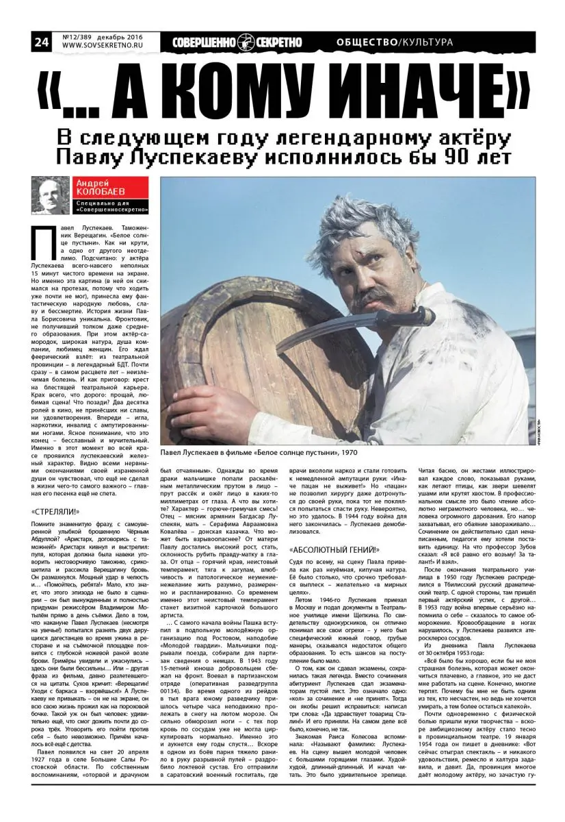 Павел Луспекаев. Таможенник Верещагин. «Белое солнце пустыни». Как ни крути, а одно от другого неотделимо. Подсчитано: у актёра Луспекаева всего-навсего неполных 15 минут чистого времени на экране. Но именно эта картина (в ней он снимался на протезах, потому что ходить уже почти не мог), принесла ему фантастическую народную любовь, славу и бессмертие. История жизни Павла Борисовича уникальна. Фронтовик, не получивший толком даже среднего образования. При этом актёр-самородок, широкая натура, душа компании, любимец женщин. Его ждал феерический взлёт: из театральной провинции – в легендарный БДТ. Почти сразу – в самом расцвете лет – неизлечимая болезнь. И как приговор: крест на блестящей театральной карьере. Крах всего, что дорого: прощай, любимая сцена! Что позади? Два десятка ролей в кино, не принёсших ни славы, ни удовлетворения. Впереди – игла, наркотики, инвалид с ампутированными ногами. Ясное понимание, что это конец – бесславный и мучительный. Именно в этот момент во всей красе проявился луспекаевский железный характер. Видно всеми нервными окончаниями своей израненной души он чувствовал, что ещё не сделал в жизни чего-то самого важного – главная его песенка ещё не спета.