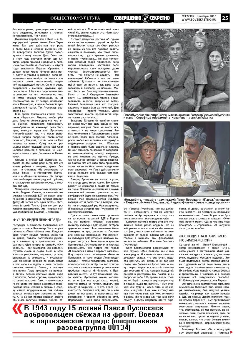 Конечно, потом в театре этот его публичный выпад резко осудили. Но он всё равно остался при своём мнении: тот факт, что кто-то наблюдал за умирающим от голода блокадным Ленинградом в бинокль, его, фронтовика, не мог не взбесить. И в этом был весь Луспекаев!