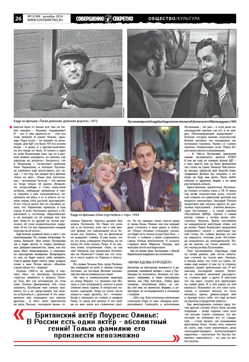 Четырежды оскароносный британский актёр Лоуренс Оливье, посетивший несколько спектаклей БДТ во время своего визита в Ленинград, оставил истории фразу: «В России есть один актёр – абсолютный гений! Только фамилию его произнести невозможно». Эта непроизносимая для британца фамилия – Луспекаев.