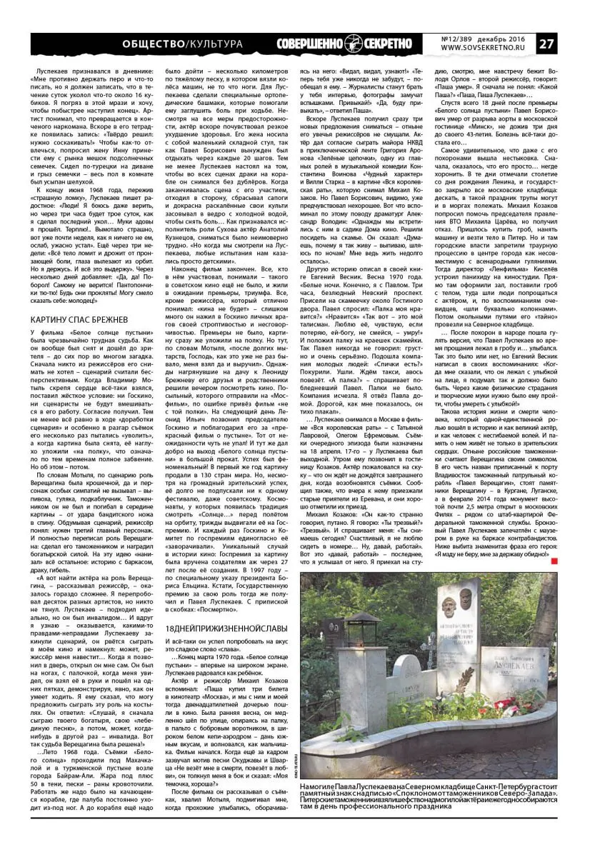 … После похорон в народе пошла гулять версия, что Павел Луспекаев во время прощания лежал в гробу и… улыбался. Так это было или нет, но Евгений Весник написал в своих воспоминаниях: «Когда мне сказали, что он лежал с улыбкой на лице, я подумал: так и должно было быть. Через какие физические страдания и творческие муки нужно было ему пройти, чтобы умереть с улыбкой!»