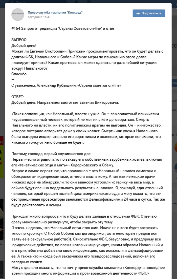Пригожин заявил, что ему бы очень хотелось, чтобы Навальный выздоровел. Если блогер скончается, не с кого будет «отрезать мясо по кусочку». Что касается Любови Соболь, то некоторые люди, как сообщает издание, советуют бизнесмену взять её в «рабство сексуального характера», однако он планирует с ней договориться. С ФБК будут разбираться юристы, цель которых – продемонстрировать всем «грязные и лживые» методы работы Фонда. Бизнесмен также намерен выяснить, кем именно были заказаны ФБК «расследования».