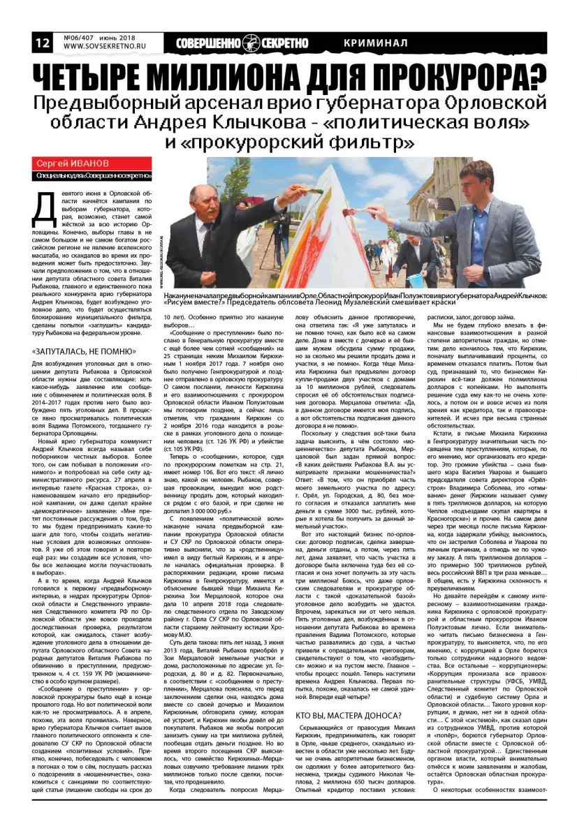 «Сообщение о преступлении» было послано в Генеральную прокуратуру вместе с ещё более чем сотней «сообщений» на 25 страницах неким Михаилом Кирюхиным 1 ноября 2017 года. 7 ноября оно было получено Генпрокуратурой и позднее отправлено в орловскую прокуратуру. О самом послании, личности Кирюхина и его взаимоотношениях с прокурором Орловской области Иваном Полуэктовым мы поговорим позднее, а сейчас лишь отметим, что гражданин Кирюхин со 2 ноября 2016 года находится в розыске в рамках уголовного дела о похищении человека (ст. 126 УК РФ) и убийстве (ст. 105 УК РФ).